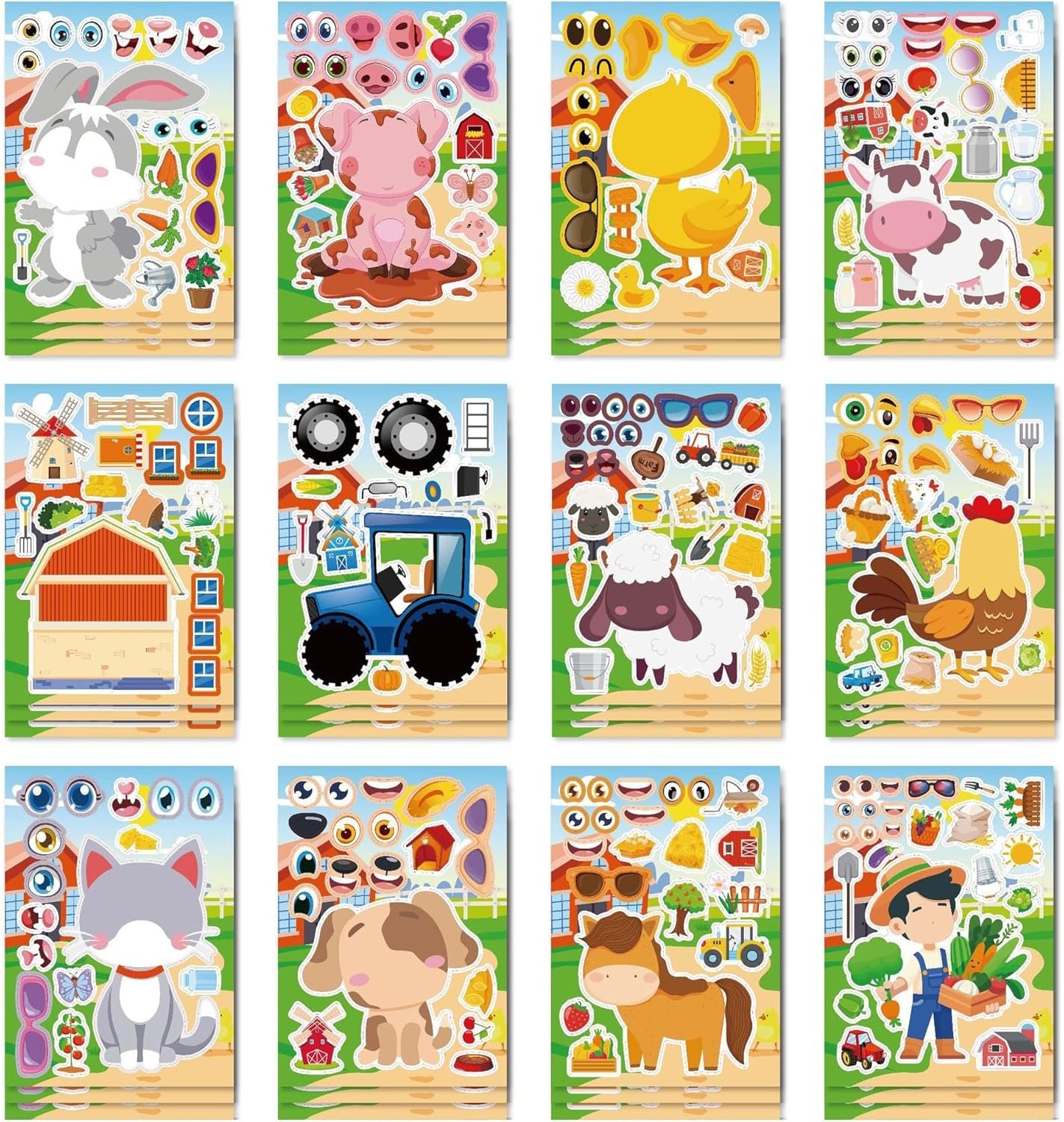 KIDS PARTY FAVORS: The 36 sheets farm animal stickers totally have 3 types of eyes and mouths for each sheet. Mix and Match Game will bring endless fun for kids during party time. The farm stickers (size:8.2×5.9in) are really great addition to activities, such as party favor, road trip and classroom activity.