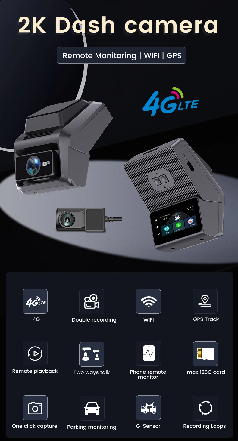3Inch2K 4Gdashcam with dual lens record wifi gps tracking fit remote live video check on phone 12-24v power supply 4g car camera