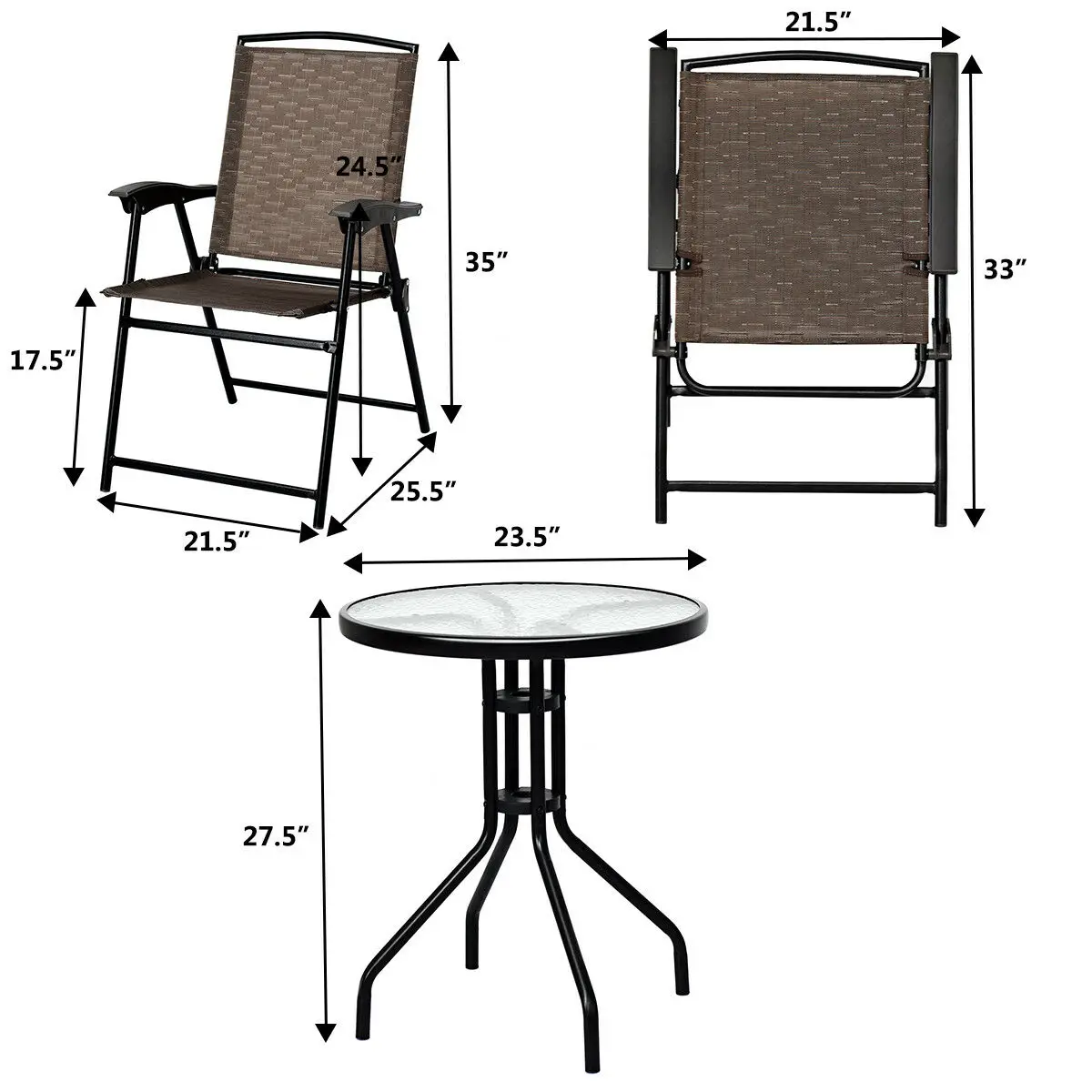 3PC Bistro Patio Garden Furniture Set 2 Folding Chairs Glass Table Top Steel