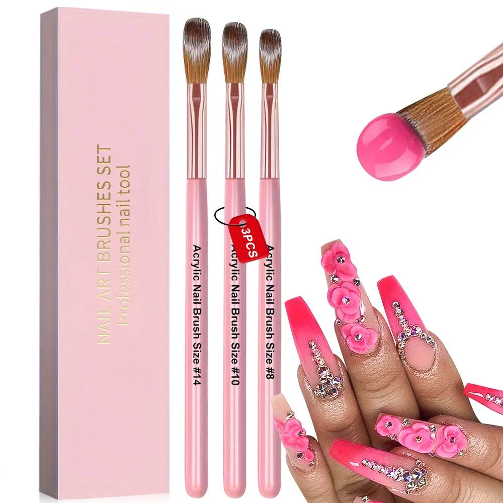 3Pcs Acrylic Application Nail Brush 8/10/14# Professional Pink Nail Brushes for Acrylic Powder Extension Nail Art 3D Carving Pen