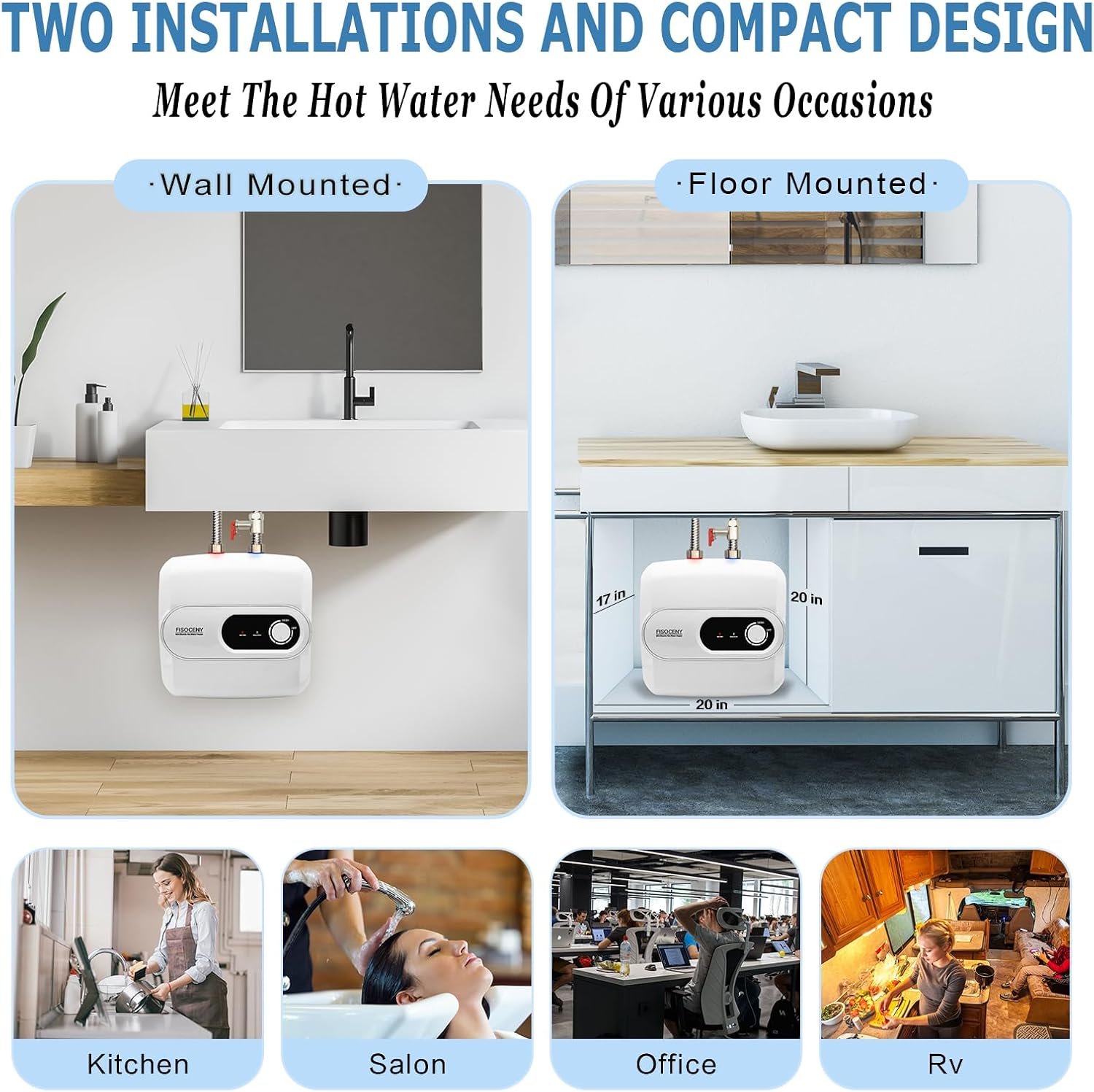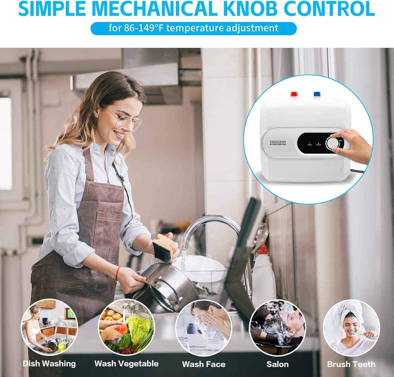 Energy Efficient and Easy to Use:FISOCENY mini tank electric water heater have excellent energy efficiency level. our water heaters with thermal efficiency up to 90%,higher energy efficiency ,Providing immediate hot water at the point of use whenever you need it.instant hot water is always on demand.saving energy and your bills.mechanical knob switch design supports temperature adjustment from 86℉ to 149℉.which is simple and practical.