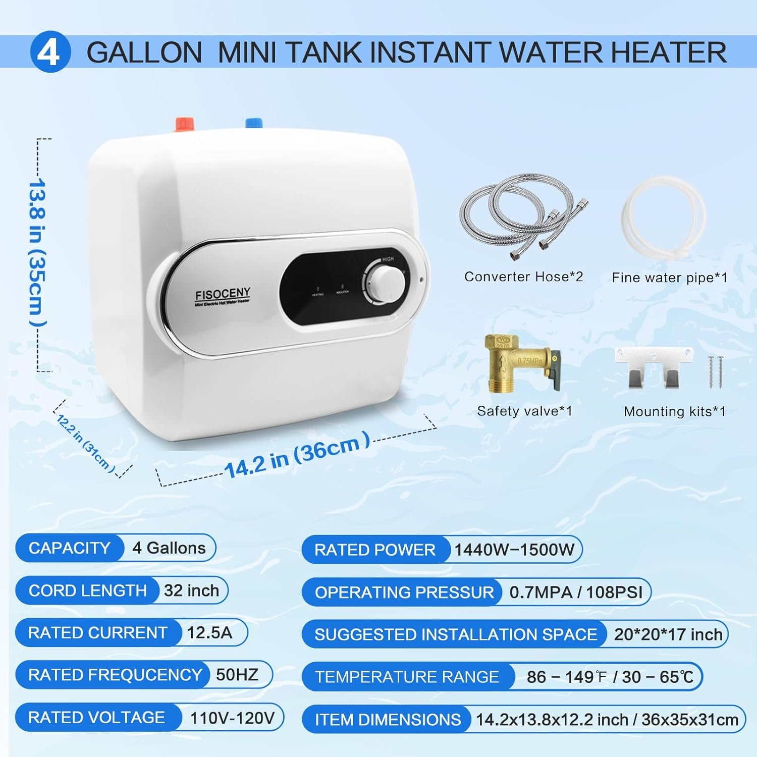 Brand Name: FISOCENY Product Name: Fisoceny 4 Gallon under sink mini tank water heater Voltage: 110v-120v Power: 1440w/1500w Color: White,Black&white Dimensions: 14.42″L x 12.2″H x 13.8″W Installation space: above 20″L x 17″H x 20″W suggested Feature: Adjustable Temperature,Easy To Install,Overheat Protection,High Pressure Release,Temperature Lock Usage: Kitchen,Hair Salon,RV,Truck,Office,Restaurant,etc. Mounting Type: wall mounted or shelf mounted or floor mounted Outlet Method: Up Outlet Heating Range: 86-149℉(30-65℃) Control Method: Mechanical knob Package Including: Under Sink Water Heater x 1,Pressure Release Valve x 1,Installation Bracket x 1,Screws x 2,Female Water Pipe to Female Water Pipe x 2 Tips: 1.Fill the water before the first power on use, otherwise it will cause a high temperature protection failure! 2.At least 5 inch of space should be reserved for installation to facilitate construction and subsequent maintenance. 3.It is prohibited to use ordinary patch cords to connect the water heater to avoid safety accidents caused by overheating of the circuit 4.It is prohibited to invert, tilt or lay the machine flat to avoid damage.