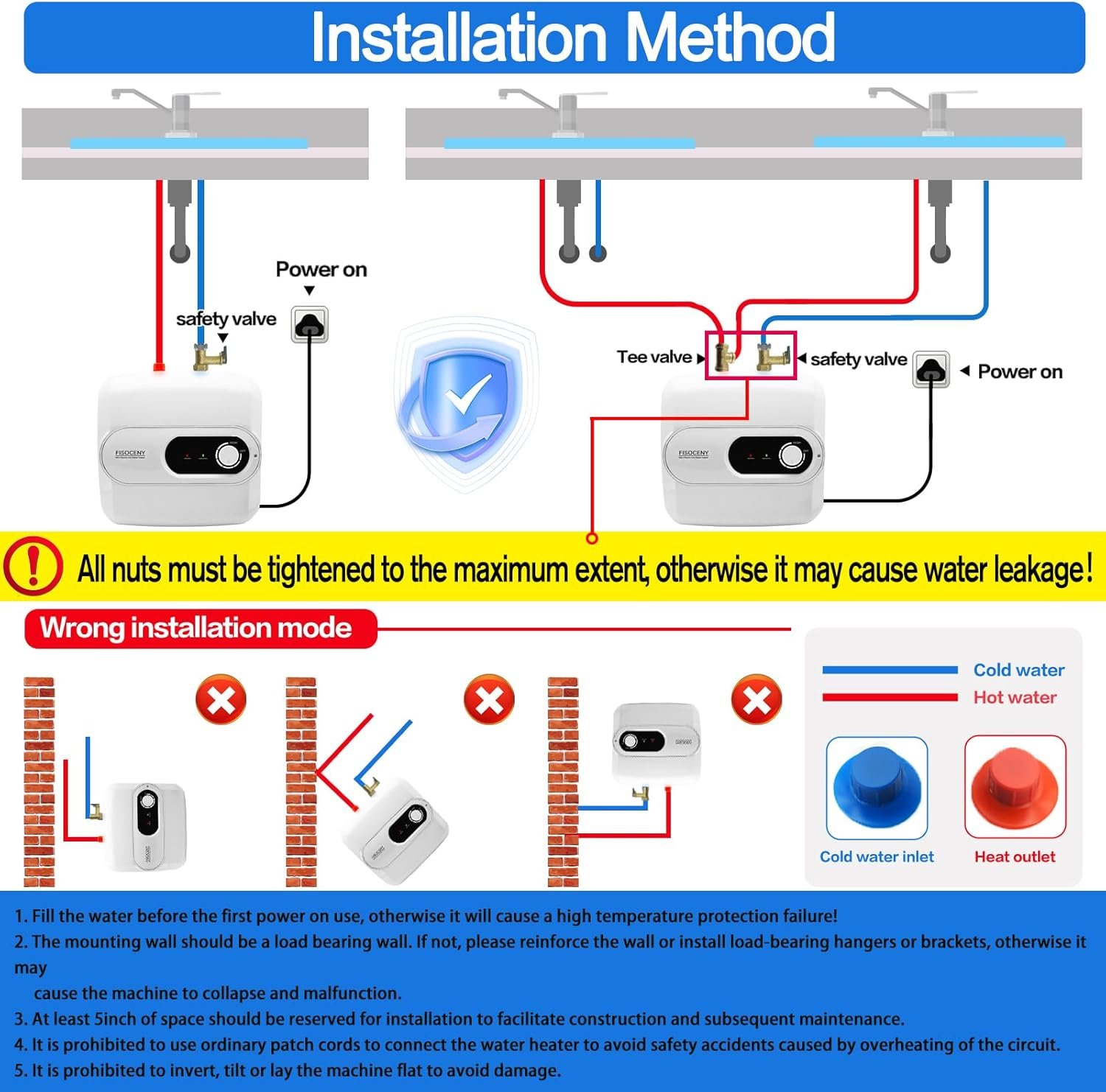 Excellent Security:FISOCENY under sink 4 gallon water heaters has many safety designs hard stainless steel tank,leakproof design,insulation material,preventing overheat,pressure relief valve,longer service life,all for your safety.Of course, to prevent water leakage, we strongly recommend that customers tighten the nuts connecting the water pipe and inlet/outlet to the maximum extent possible