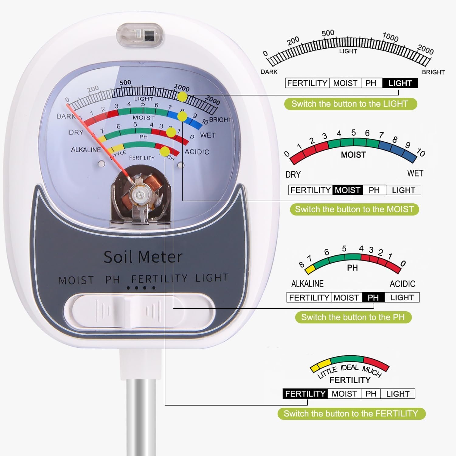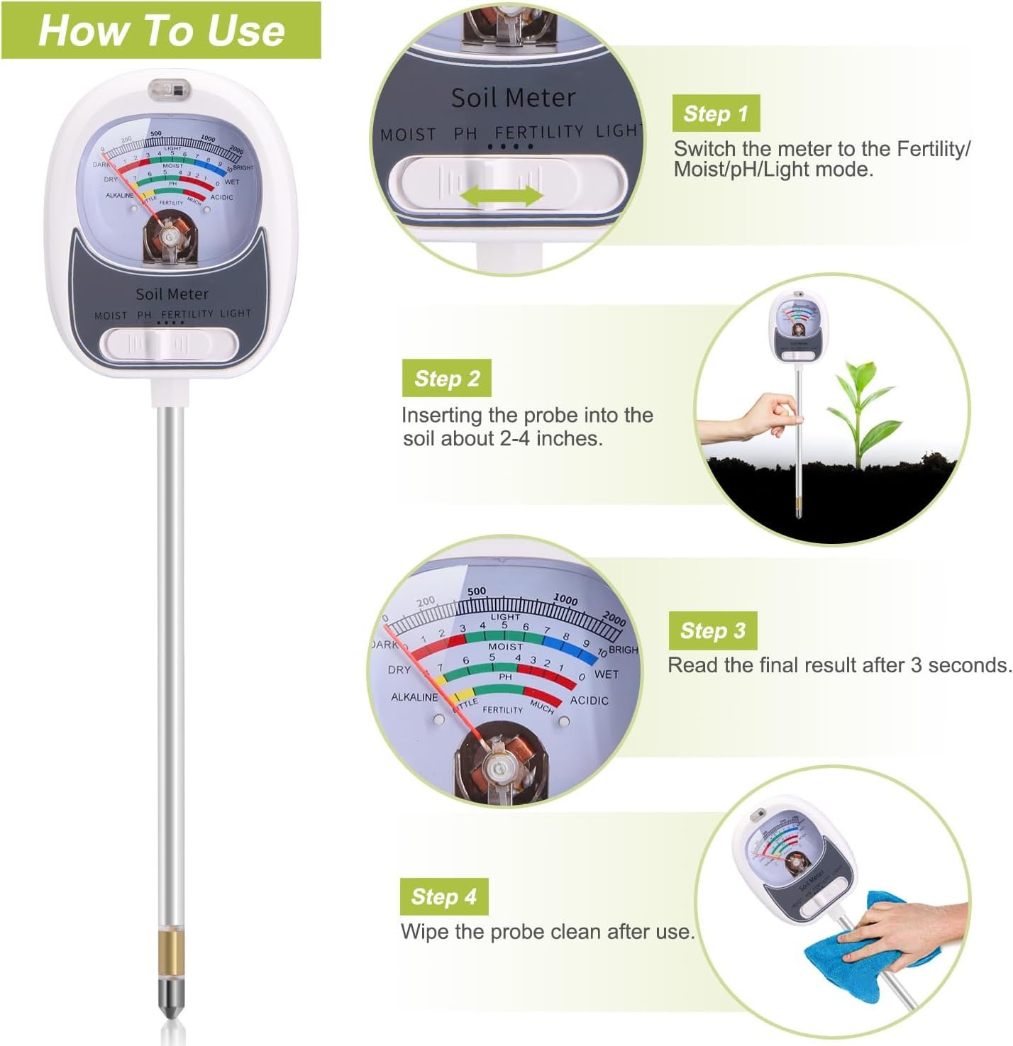 4-in-1 Soil Test Kit, Soil Moisture Meter for Fertility, Light, Moisture, PH, Soil pH Meter, Soil Tester, Moisture Meter for House Plants, Garden, Lawn, Farm, Indoor & Outdoor Use(Pearl White)
