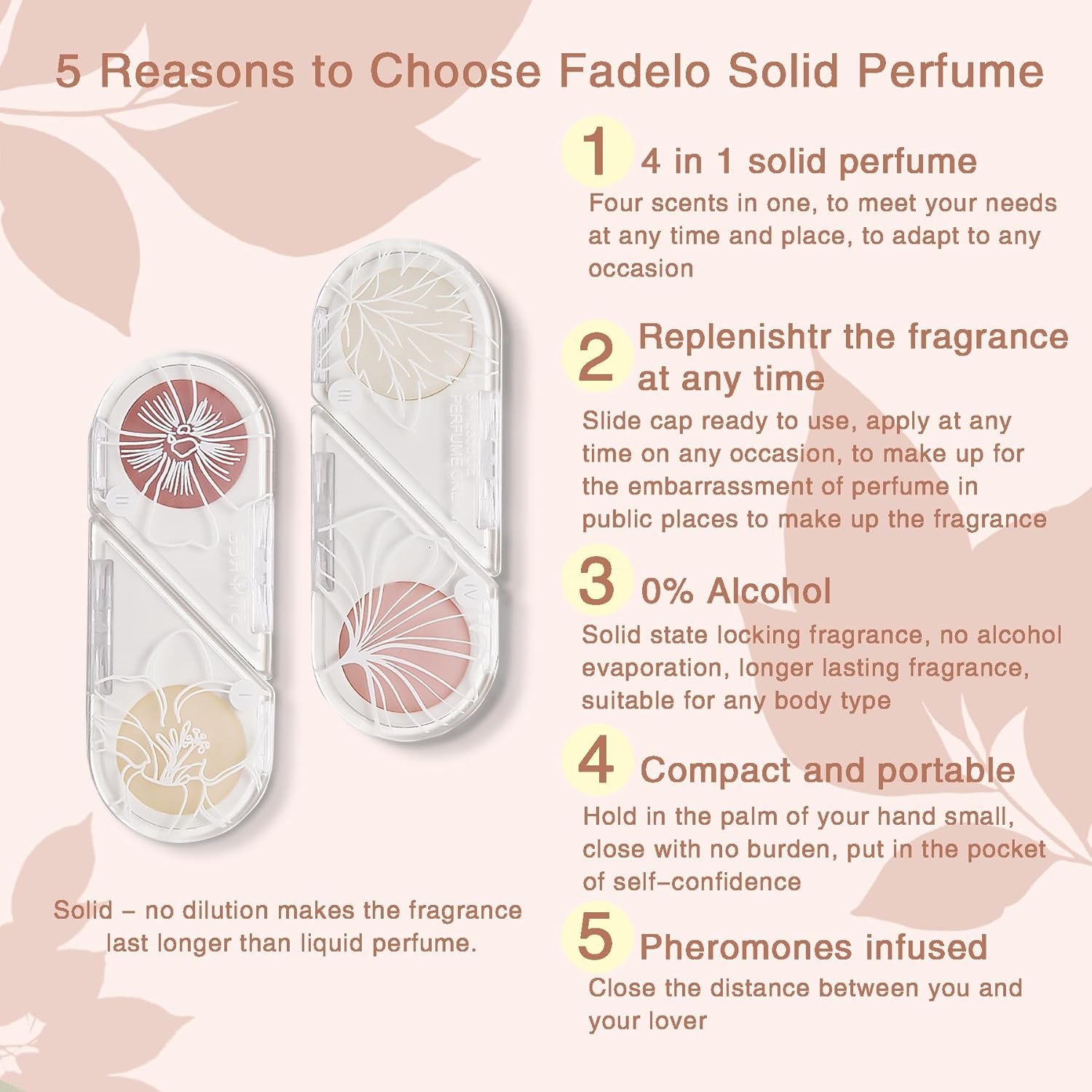 PHEROMONES INFUSED: Each fragrance exudes a different scent that will instantly capture the attention of others from the moment she steps into the room;Fadelo solid balm for the women who wants to boost her confidence
