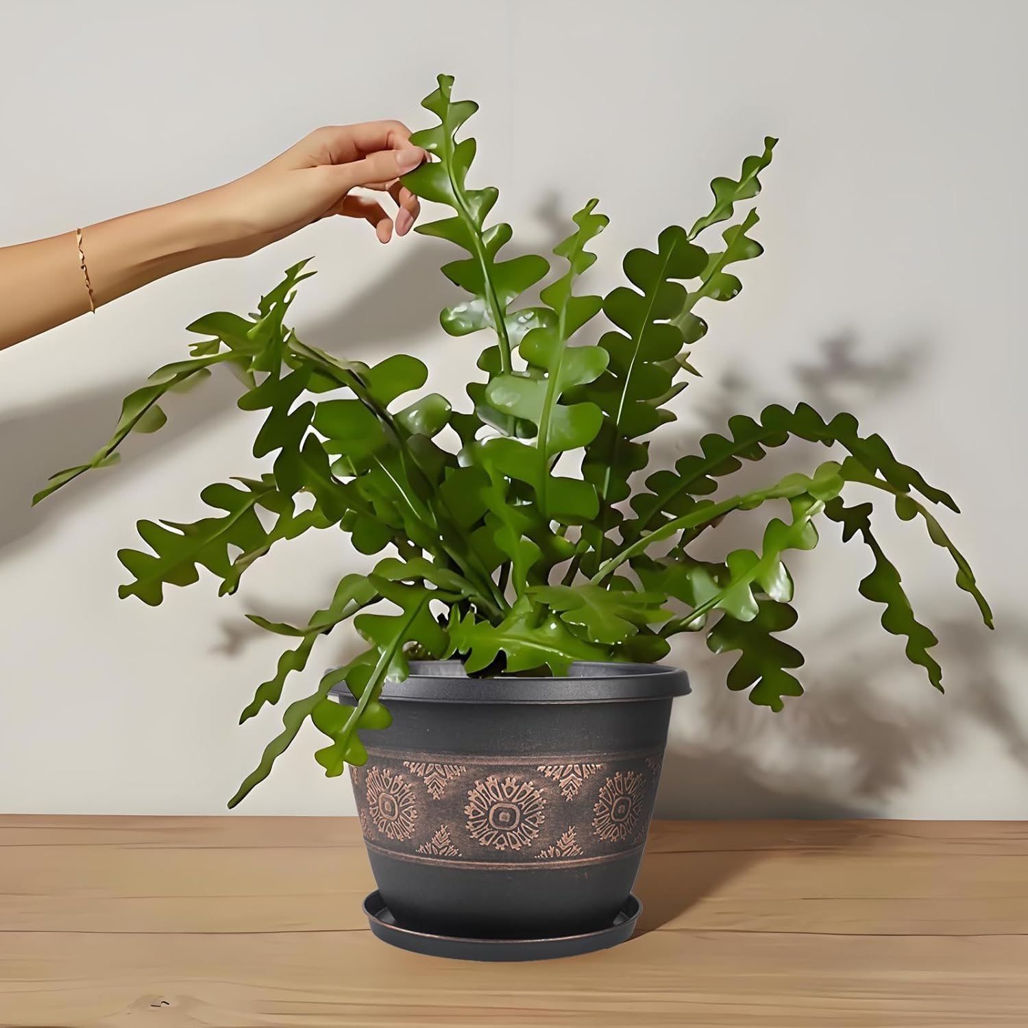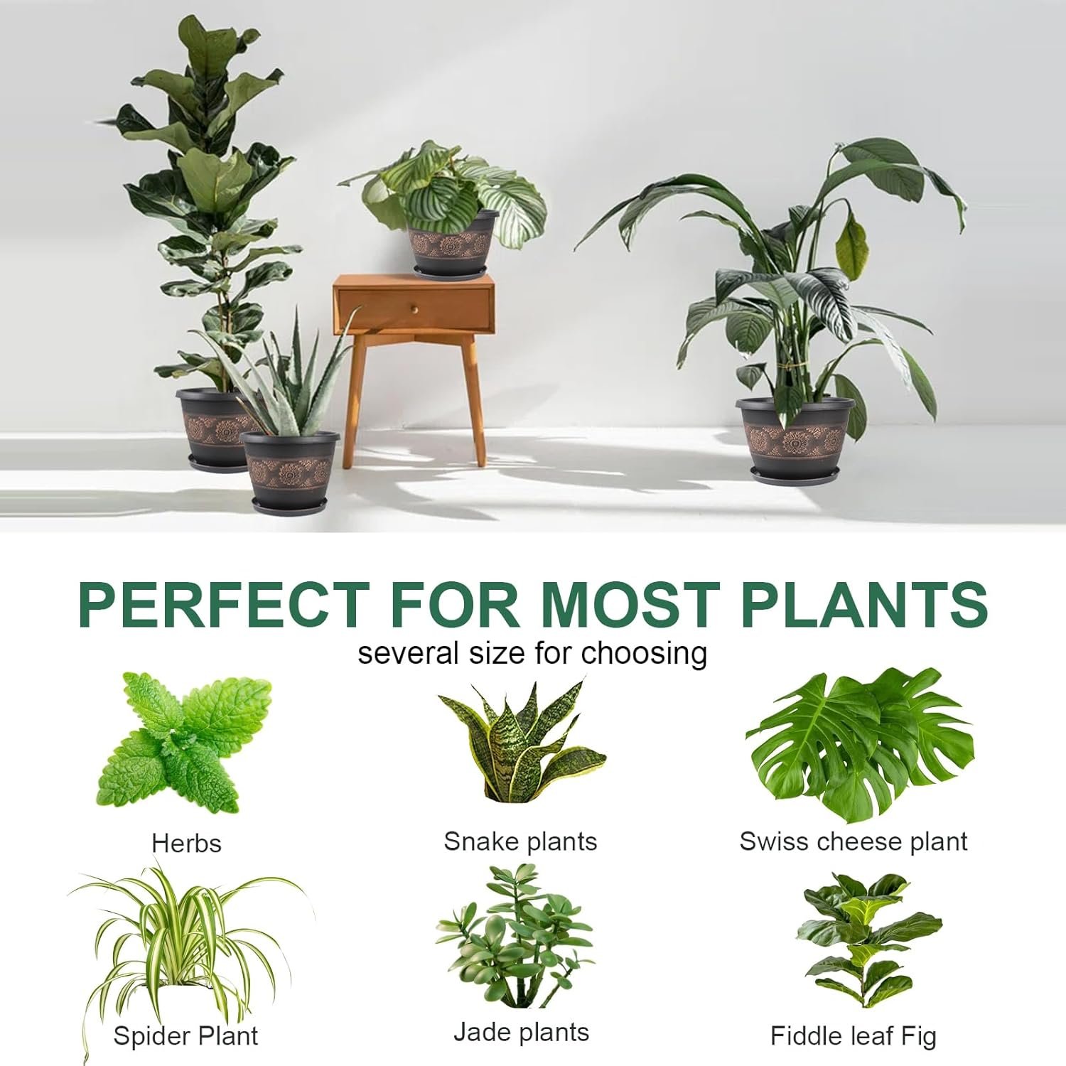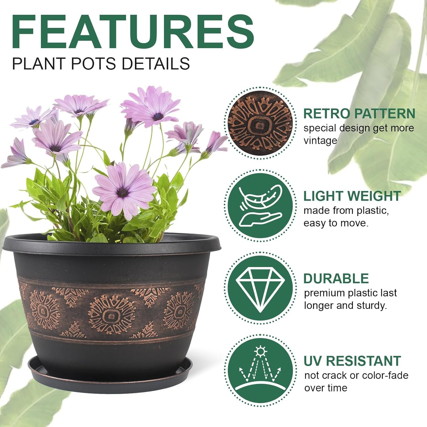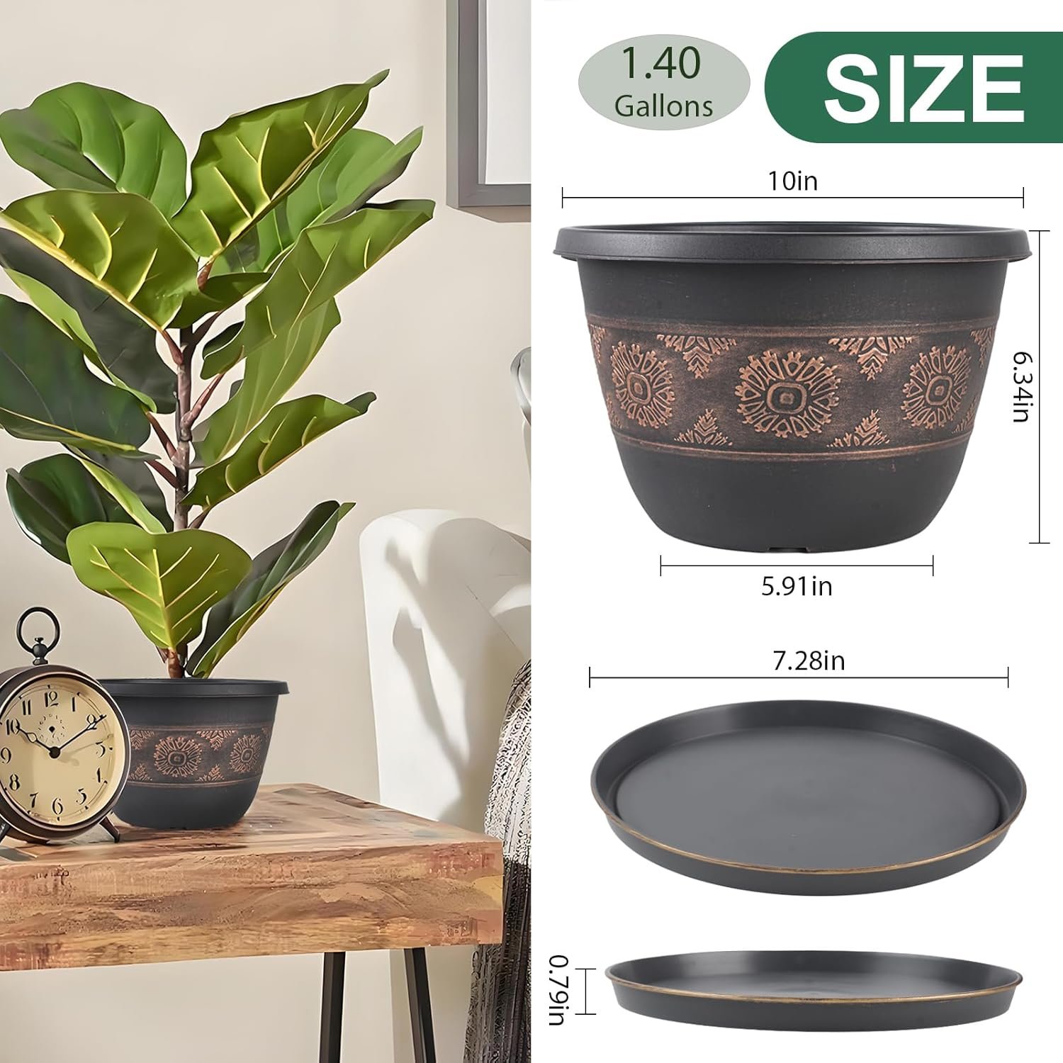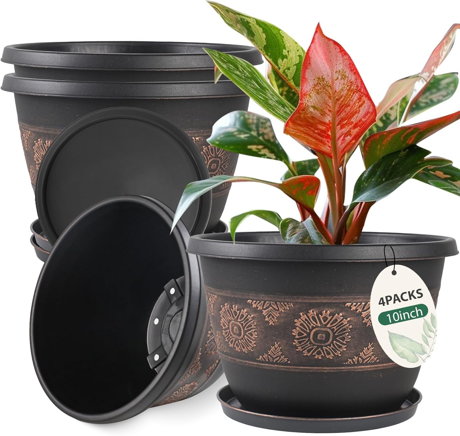 4 Pack 10 inch Plant Pots, Retro Pattern Planters with Drainage Holes and Saucer, Sturdy Plastic Garden Flower Pots for Indoor & Outdoor Plants
