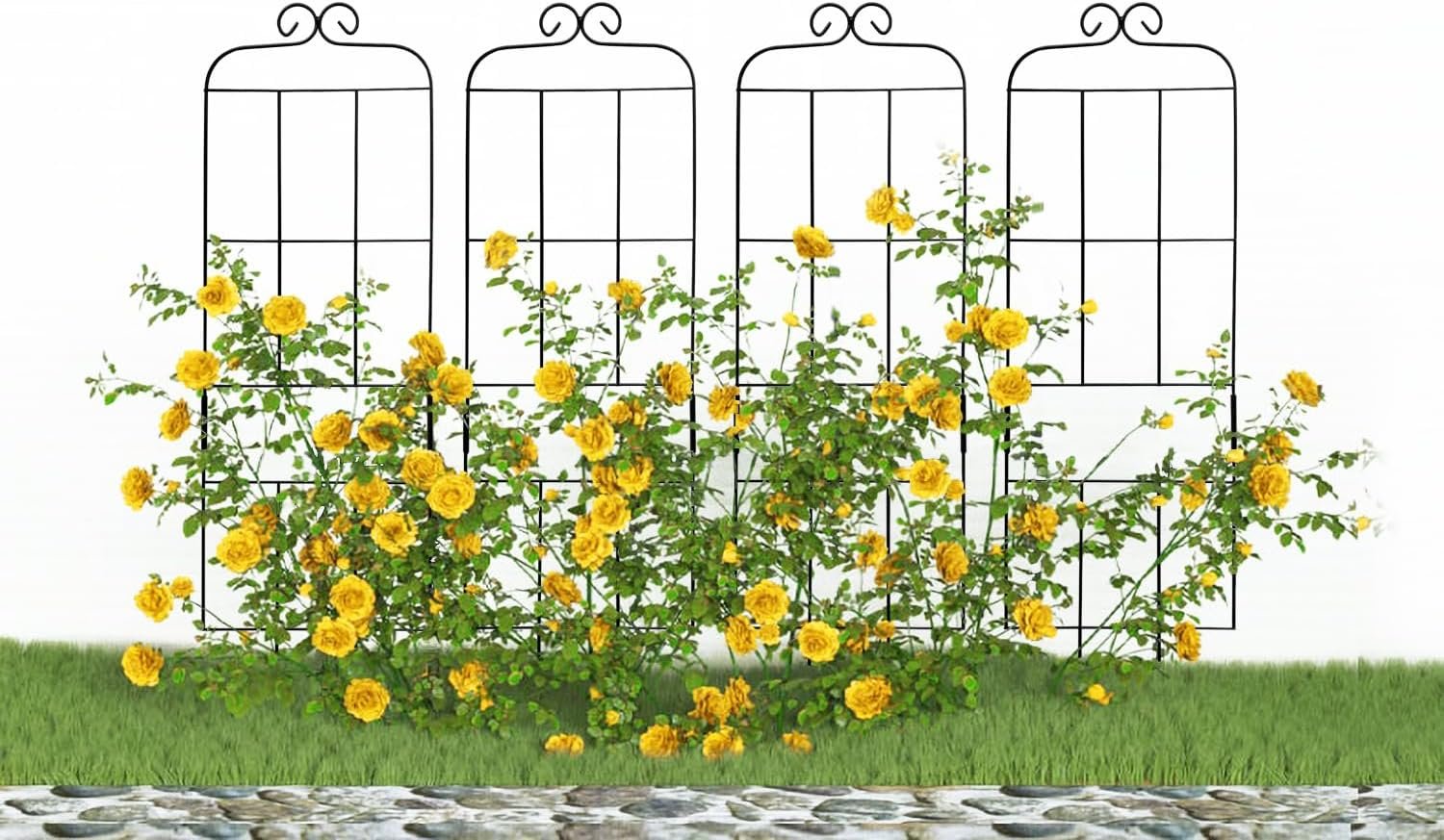 4 Pack of 31″ H x 9.5″ W iron trellises with a powder-coated finish for rust resistance, offering both function and style.