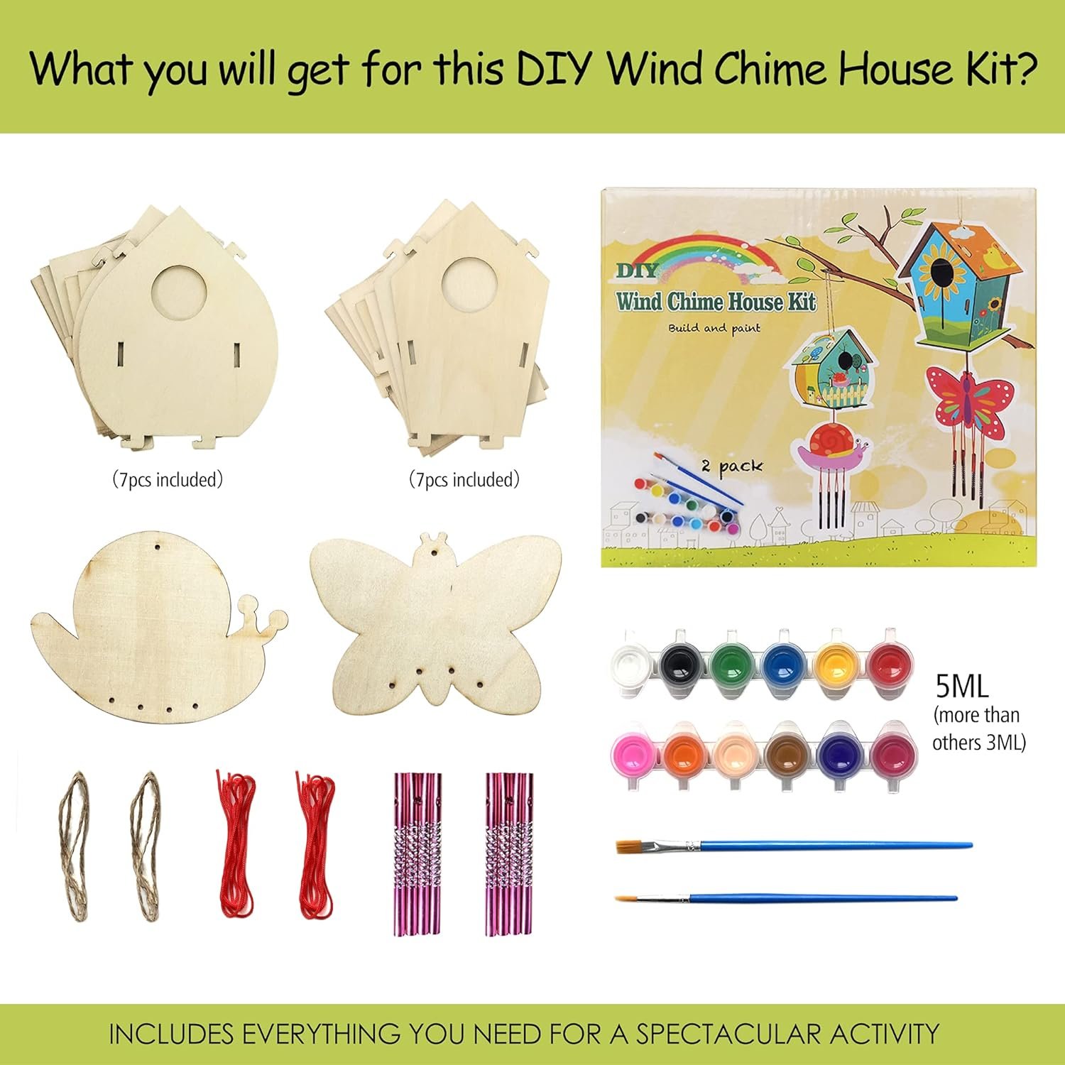 This Bird House & Wind Chime Kit has more in package. 2 pack bird house, 2 pack wind chime, 12 paints and 2 brushes, and the paints 5ml more than others 3ml. All of them are packaged in a color box.