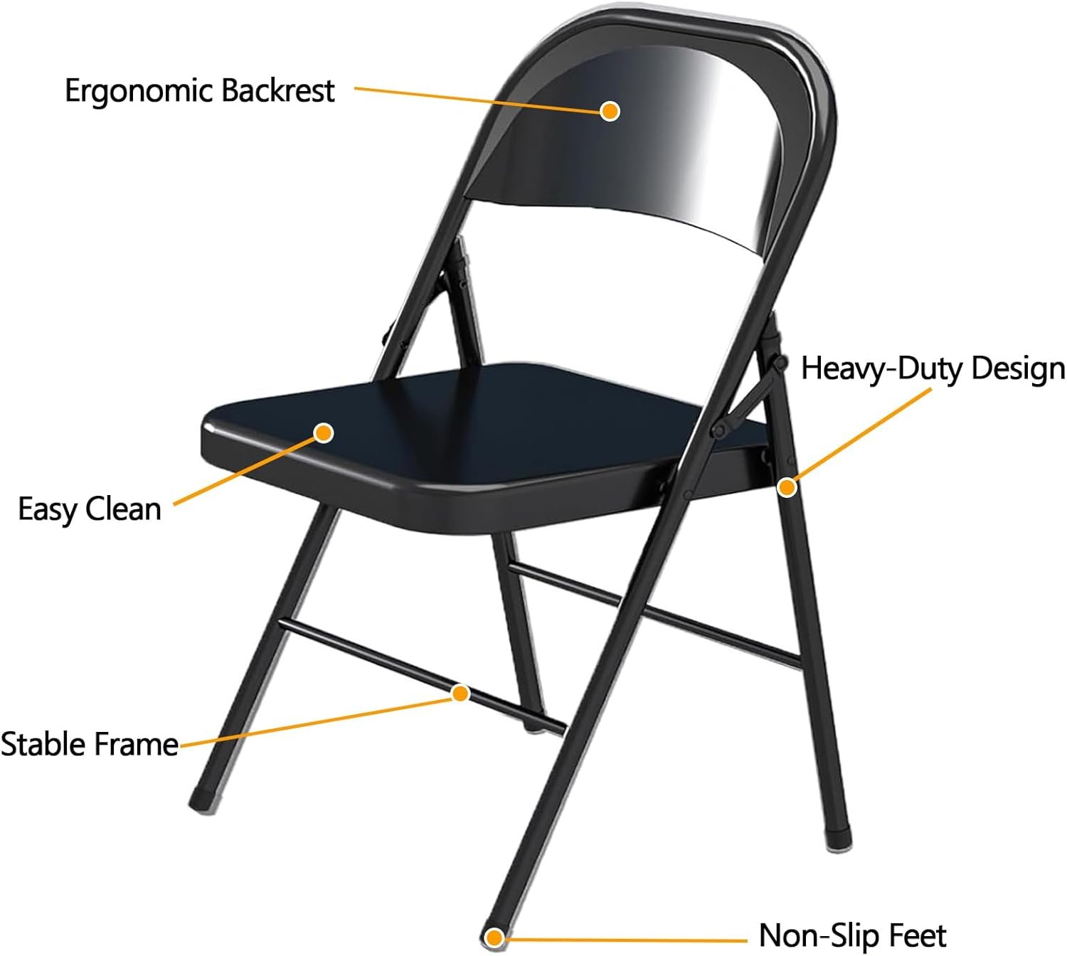 Sturdy and Durable: Our folding chairs features a thickened steel frame structured in a triangular shape, ensuring sturdy support. Non-slip pads on the chair legs prevent scratches on your floor and keep the chairs securely in place
