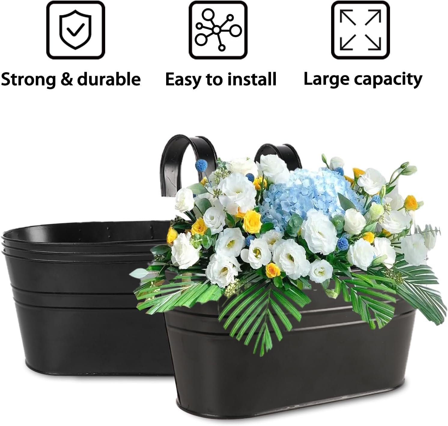 MODERN DECORATION:Window boxes planters features a convenient hanging system with detachable hooks,easy placement on different places such as railings,balconies,windows.