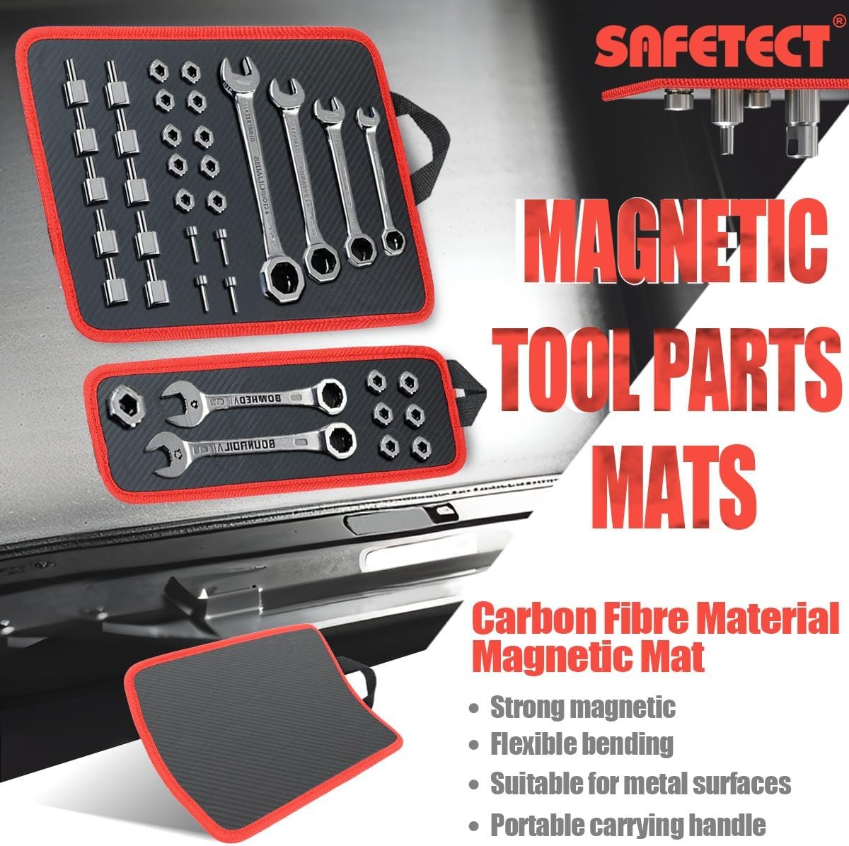 2 CARBON FIBER MAGNETIC MATS: Carbon fiber material is strong and wear-resistant, not easy to break. Magnetic tool pads are durable to protect tools and contact surfaces from scratches and damage. Magnetic tool pads are flexible and can be bent to attach to metal surfaces at the right angle. 2 sizes of magnetic pads: 13 inch x 9 inch and 13 inch x 4.5 inch. Large magnetic pad with carrying handle for easy one-handed movement
