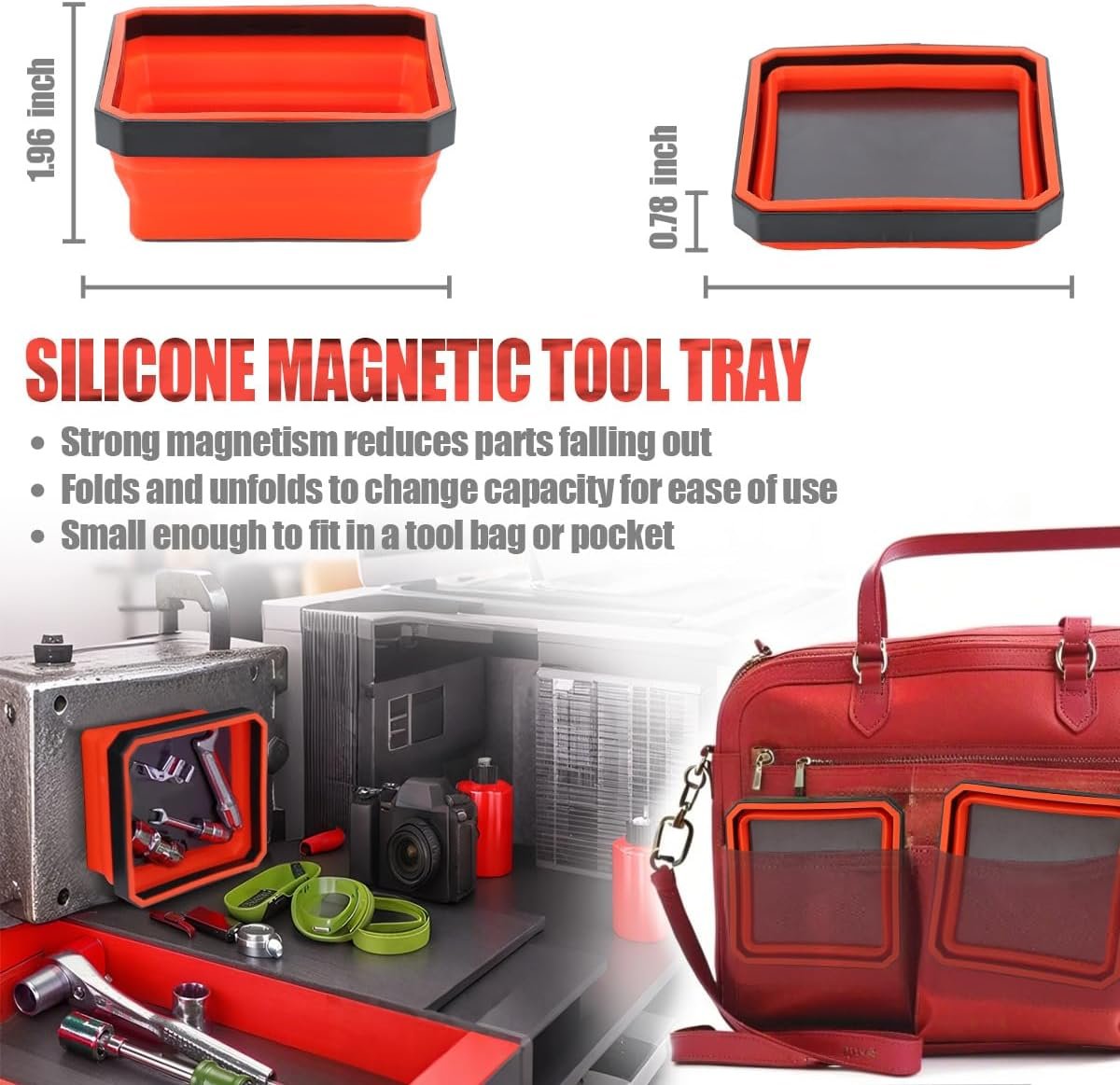 COLLAPSIBLE MAGNETIC PARTS TRAY: The silicone parts tray measures 4.45 inch x 4.45 inch and can be folded down to 0.78 inch or unfolded to a depth of 2 inch. When you are on the go, fold the magnetic parts tray into a tool bag or jacket pocket without taking up too much space
