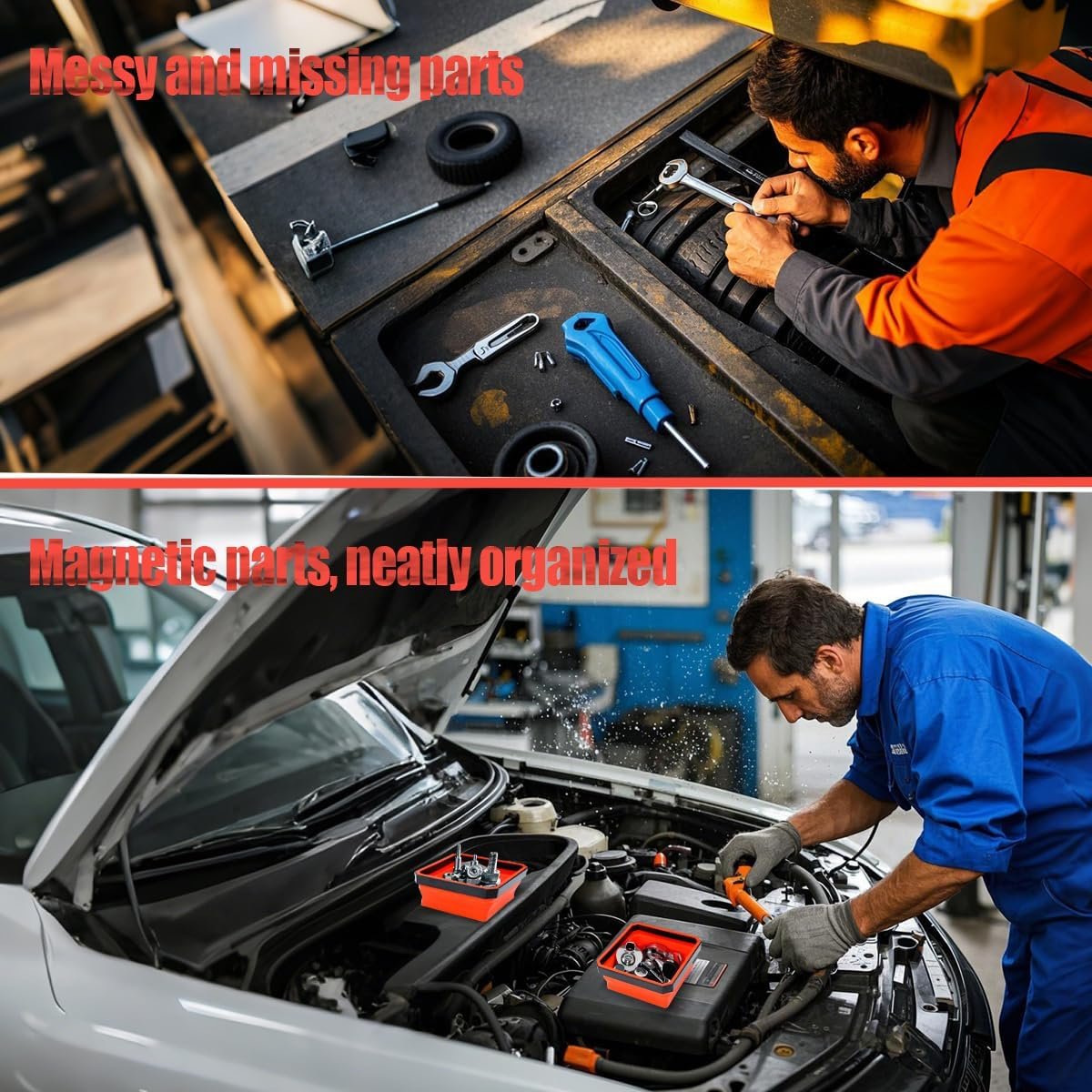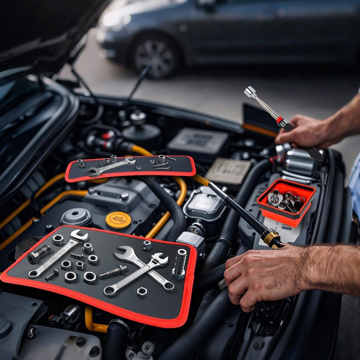 MAGNETIC PARTS TRAY SET: Magnetic tool mats organize bolts, screws, nuts, pins, washers and fastener tools. Magnetic tool mats in your toolbox or workspace drawer ensure that your tools are where they belong. Keeps all screws and tools in hand and won’t slip out of place. Strong magnetic trays can be placed on car hoods, fenders or any metal surface in the machine shop