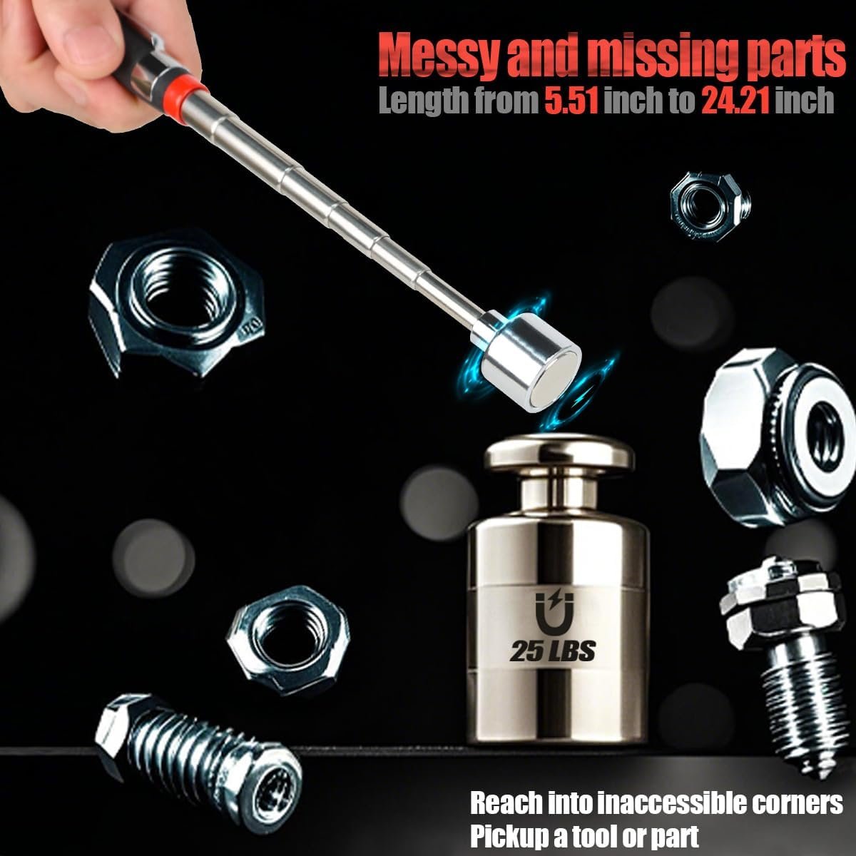 25 LB MAGNETIC PICK-UP WAND: Telescoping magnetic pick-up tool extends from 5.51 inches to 24.21 inches. Magnetic pickup wand easily reaches into tight, sight blind areas to pick up dropped screwdrivers, screws, nuts, bolts and other small metal fasteners. Use with magnetic mats and magnetic trays to reduce the loss of small metal parts and increase the efficiency of machinist’s work