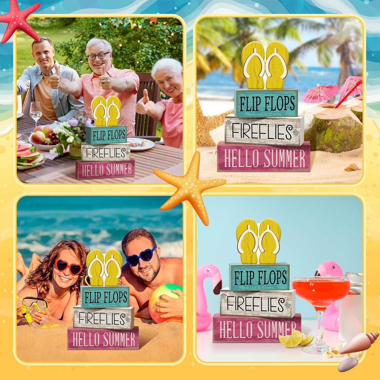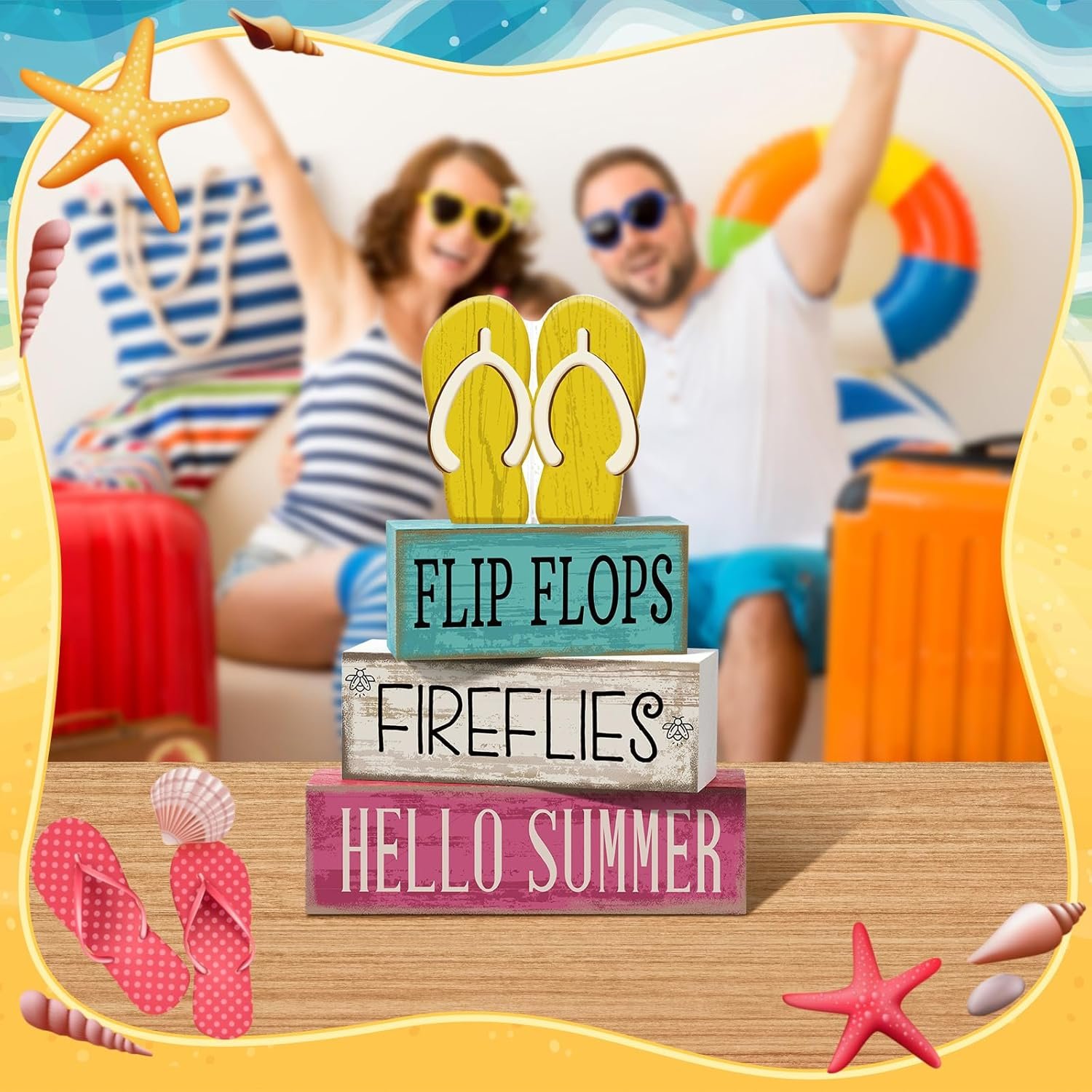Summer Decor: our summer tiered tray decor is printed with classic yellow, blue and pink color, beloved patterns; Create a mini Flip Flops corner in your space to fill it with blessings, joy, and festive charm during celebrations