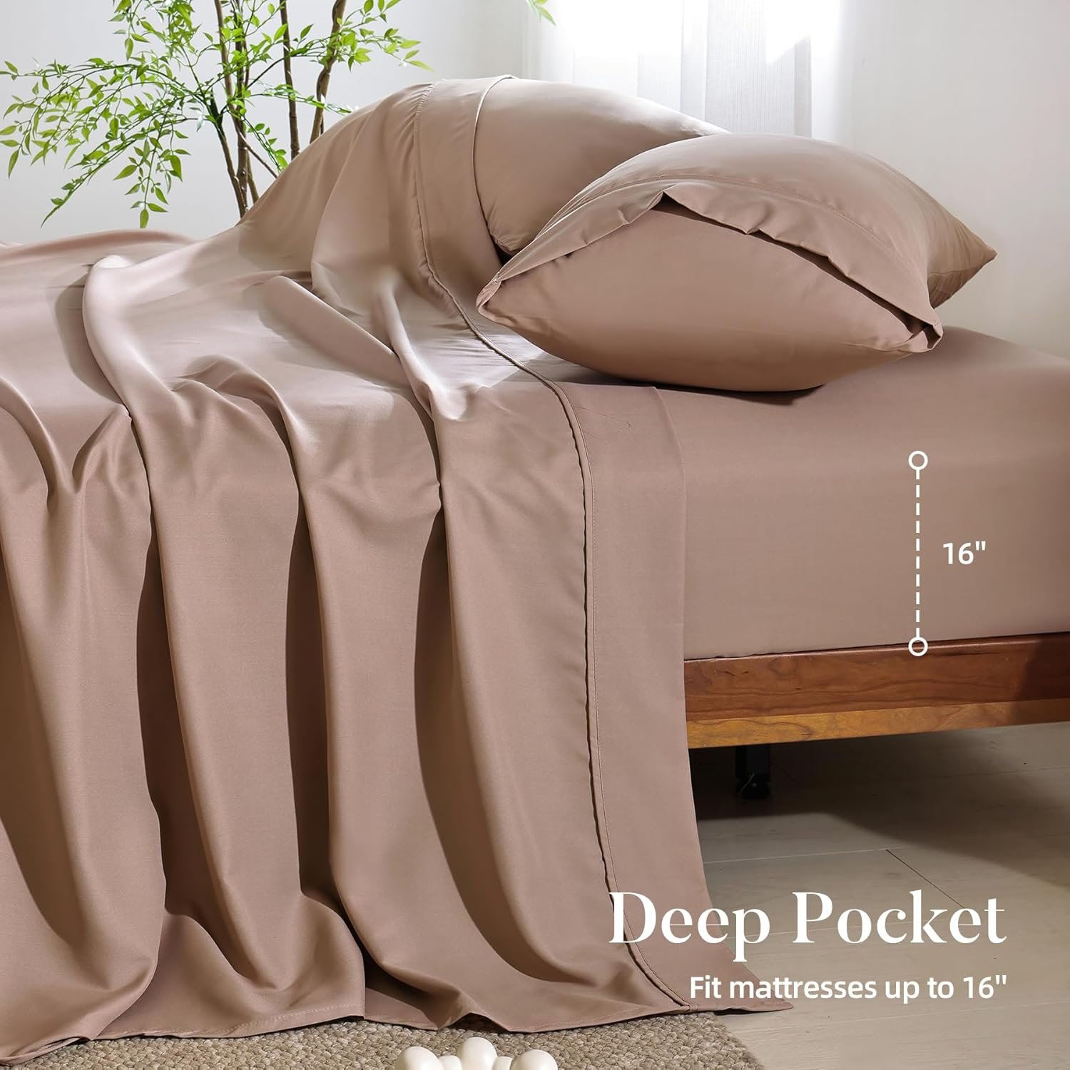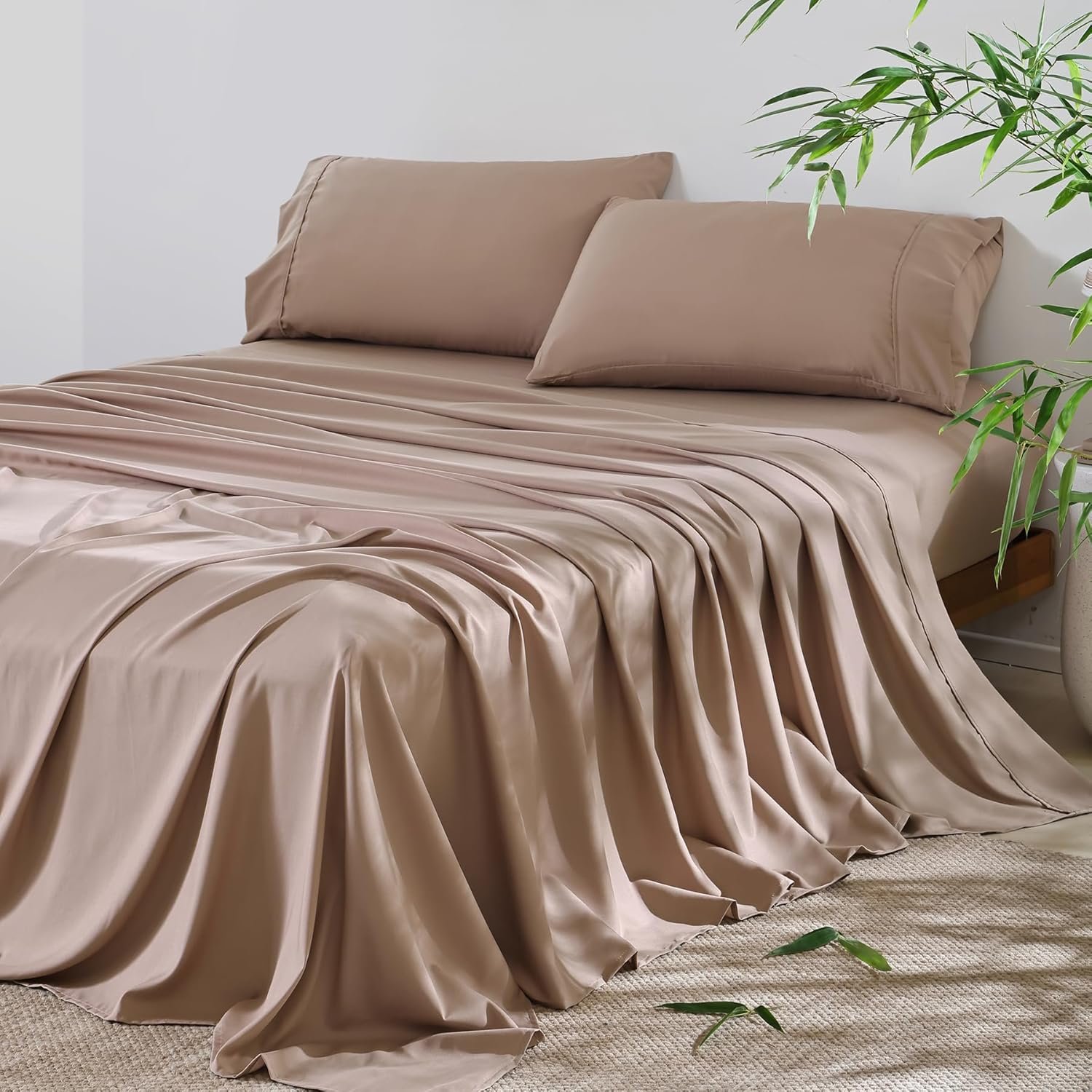4 Piece Full Size Sheet – Cooling Bed Sheets Set, Blend Rayon Derived from Bamboo, Breathable Soft Hotel Luxury Bedding & Pillowcases, Silky Fit 16 inch Extra Deep Pocket, Oeko-Tex – Taupe