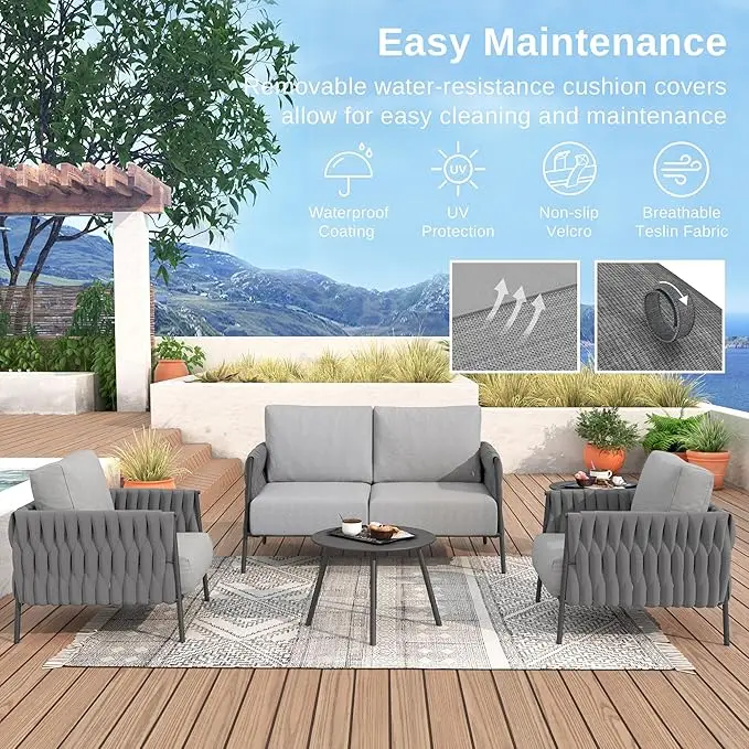 PREMIUM MATERLIAL FOR LASTING USE: Outdoor 4 pieces patio set braided from delicate Olefin wide rope has a strong visual sense and good comfort. Olefin cushion cover plus with TPU coating treatment, and is stitched with encrypted Teslin, which has good weather resistance and is breathable. Ultra-durable Olefin is thoughtfully crafted and built to withstand the extremes of sun, rain to meet the outdoor use requirements. All the durable performance is designed to ensure long-lasting comfort