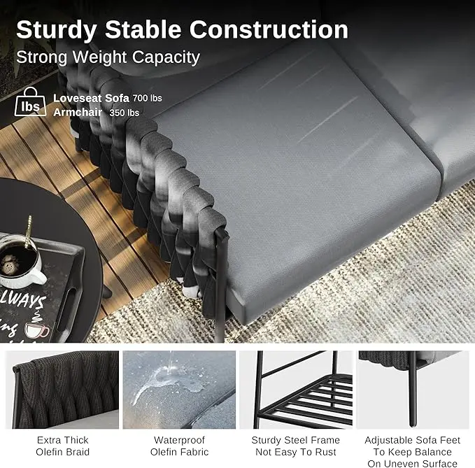 STRONG BEARING CAPACITY DESIGN: Made of high-quality iron frame, after electrophoresis and plastic spraying treatment, it has good rust and weather resistance. Loveseat sofa can provide a high load-bearing capacity of 700 lbs and two armchairs: 700 lbs.