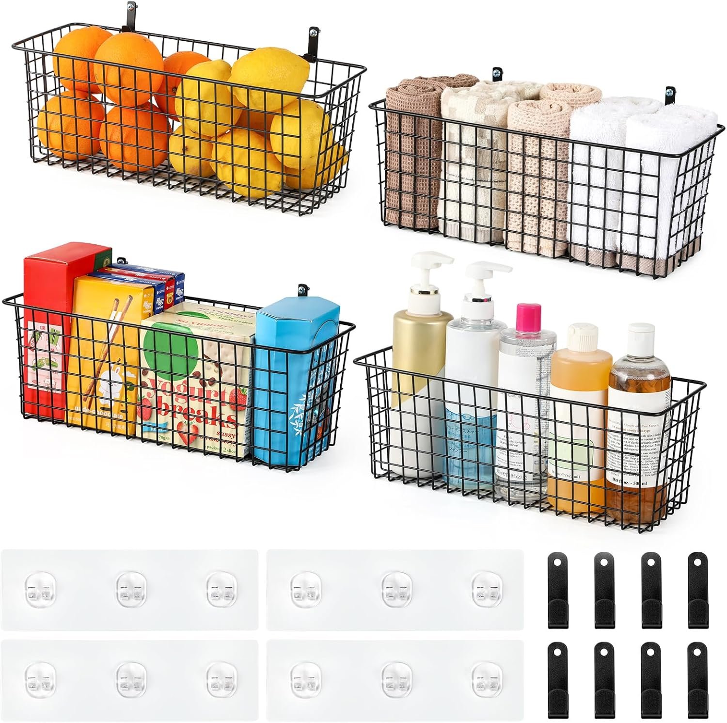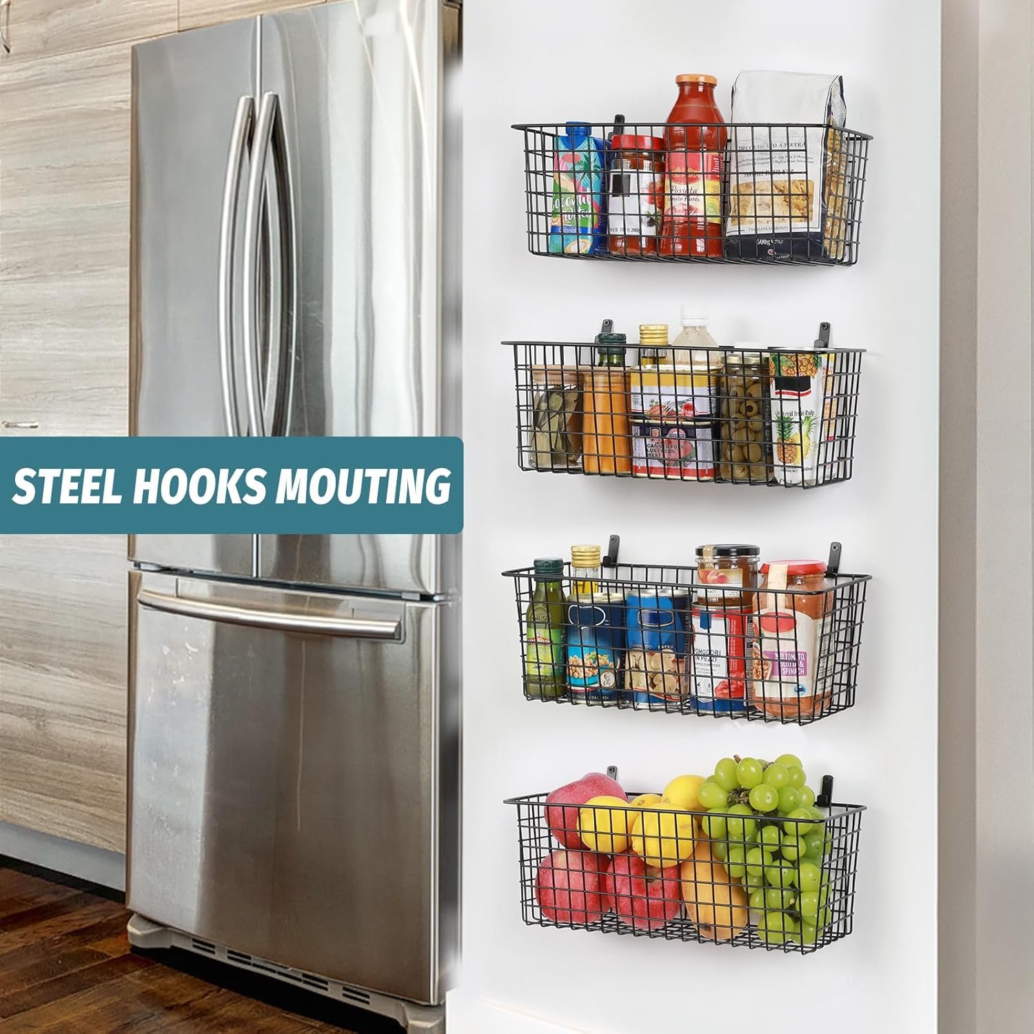 4 Set [EXTRA LARGE] Hanging Wall Mount Storage Baskets with Adhesive Hooks & Steel Hooks, Multiuse Sturdy Wire Metal Organizing Baskets for Home Kitchen Bathroom Pantry Utility Organizer, Black