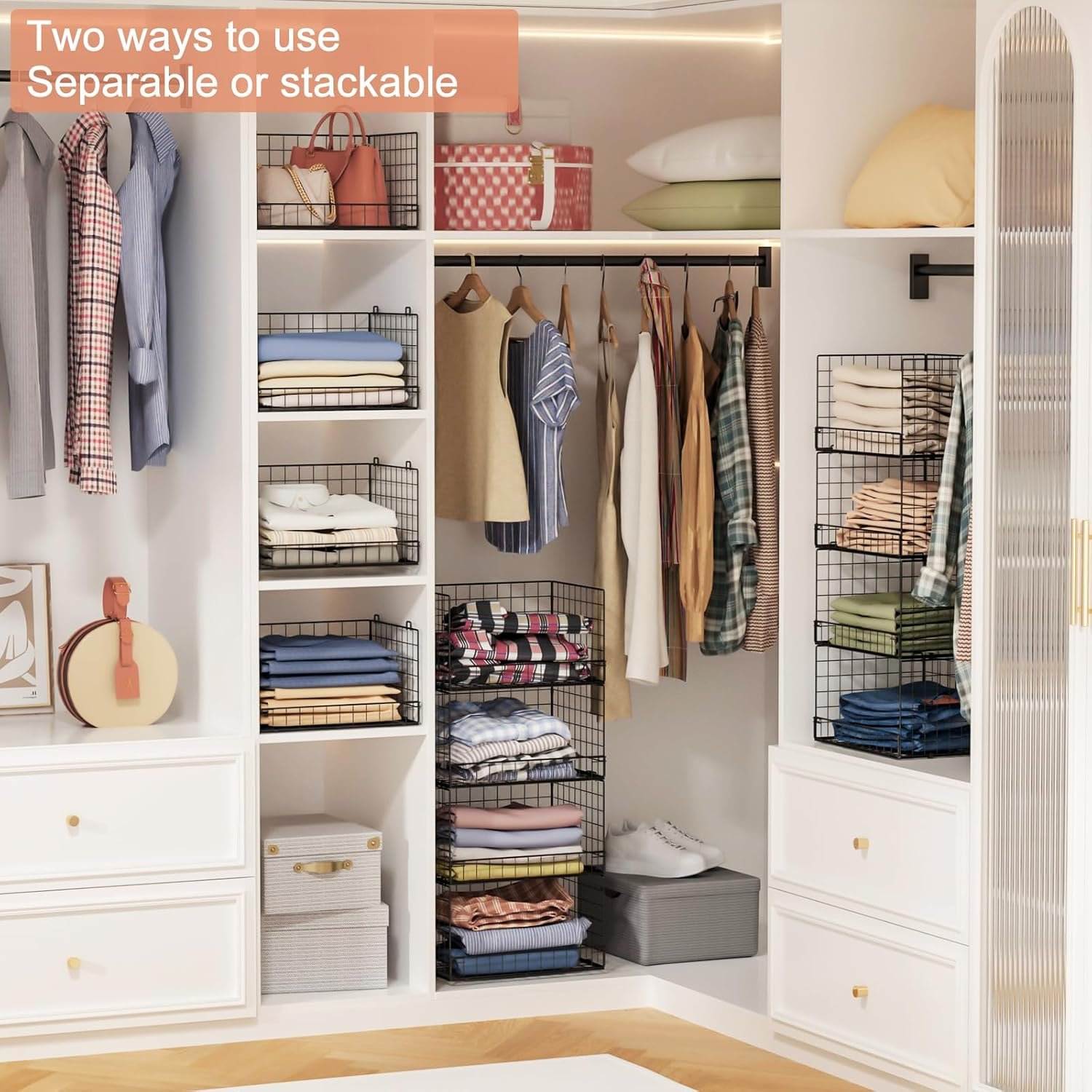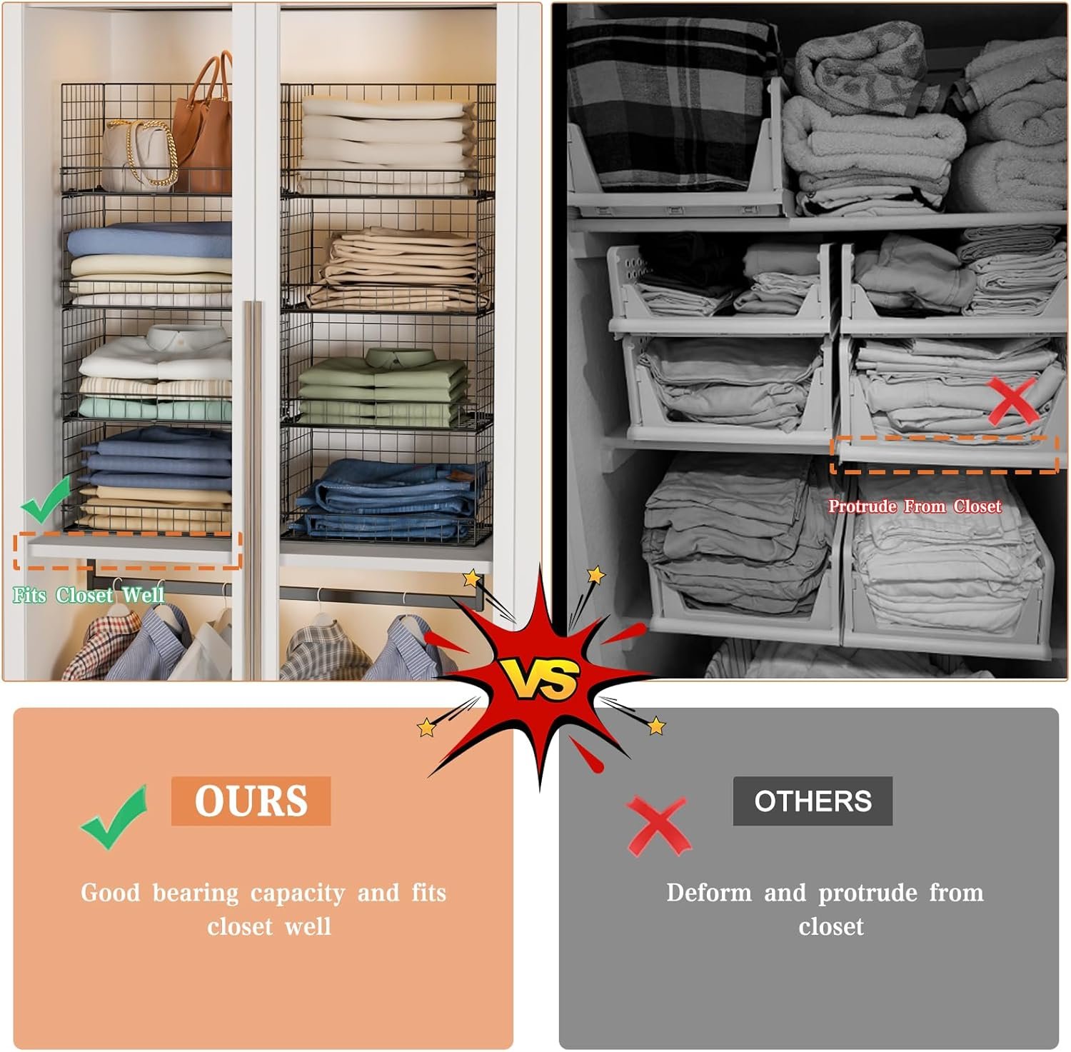 【Stackabe and Foldable】These collapsible closet shelves organizer are stackable and foldable.And can fold them to put in a corner without taking up space.You can stack multiple units together or use only one to meet your different needs.