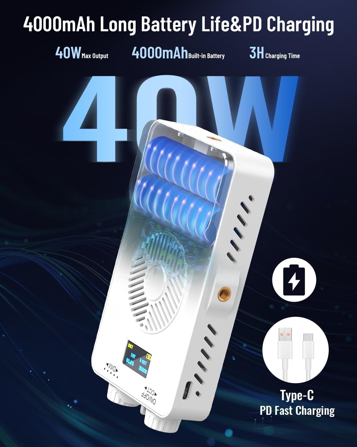 4000mAh Rechargeable Batteries&Efficient Cooling System: Equipped with dual 2000mAh batteries, the 4000mAh total capacity ensures stable illumination. With support for PD fast charging via the Type-C port, you can quickly recharge and stay ready for the next shoot. Built with an advanced cooling design, the system prevents overheating, maintaining consistent your creative process without interruptions