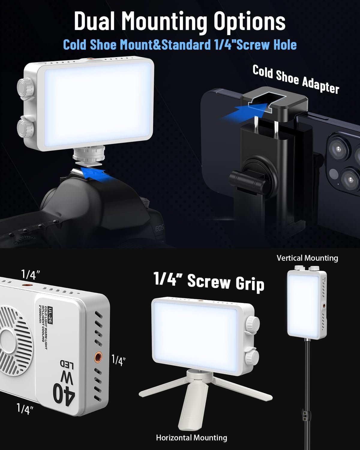 Dual Mounting Options&Portable: Designed for maximum flexibility, this video light features both a cold shoe mount and a 1/4″ threaded hole, allowing easy attachment to cameras, tripods, and etc. This portable light for camera features a sleek, compact design that fits easily into your bag or pocket and ensures you always have the perfect lighting wherever you are. Package Included: Camera Light*1, cold shoe mount*1, soft light diffuser*1, mini tripod*1, Type-C charging cable*1, user manual*1