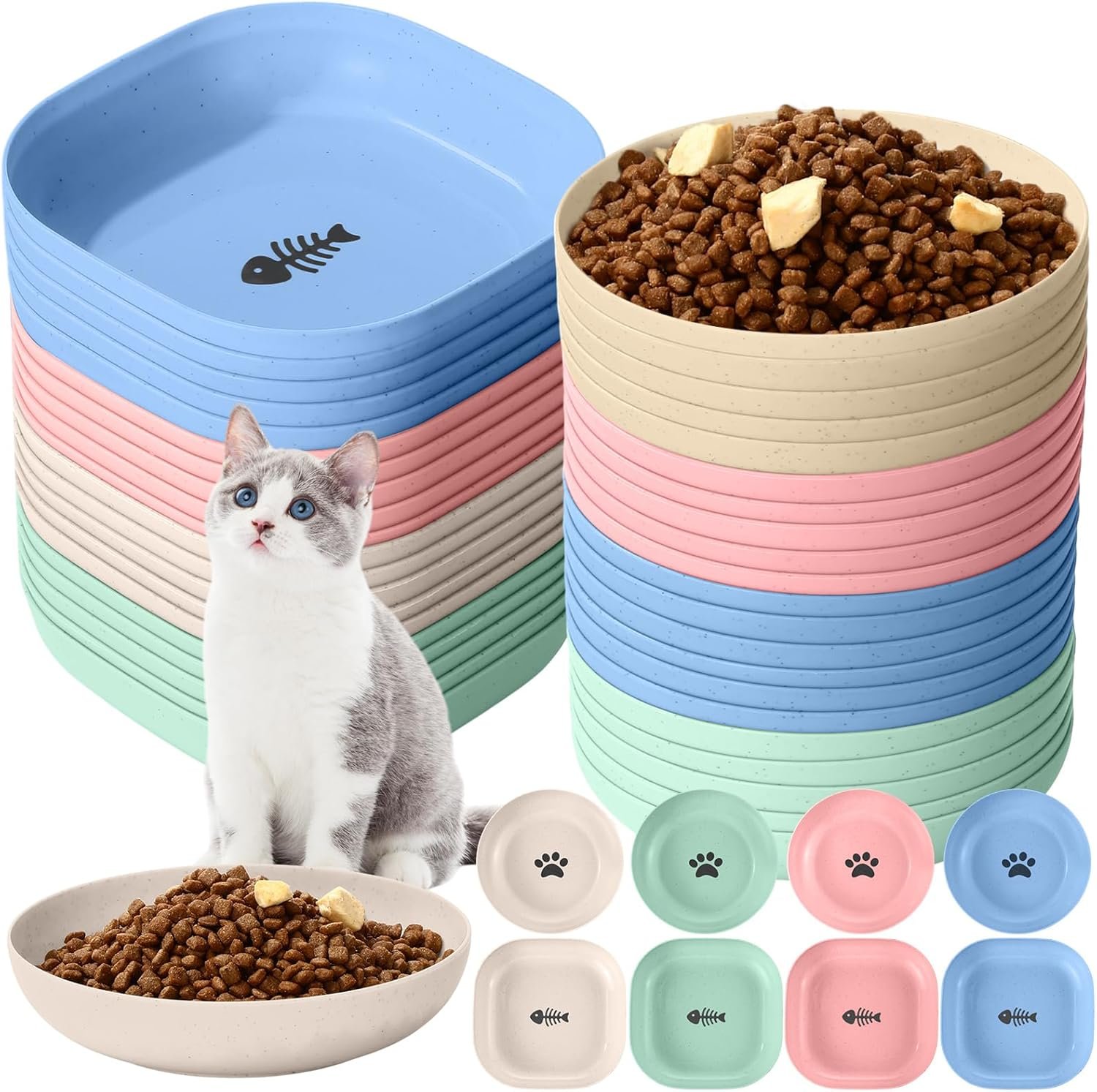 Quantity and Variety: the package includes 48 fatigue relief cat bowls, comprising of 24 square and 24 round ones; The bowls are available in four attractive colors – beige, pink, light blue, and light green; It offers sufficient quantity and variety to cater to your pets’ needs