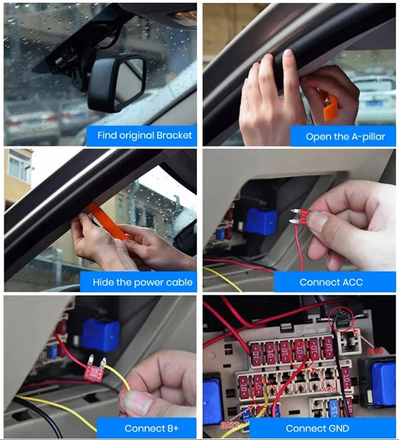 Suggest the installation area as shown in the diagram, hide the connection line along the front windshield into the ceiling and connect it to the fuse box through the A-pillar;