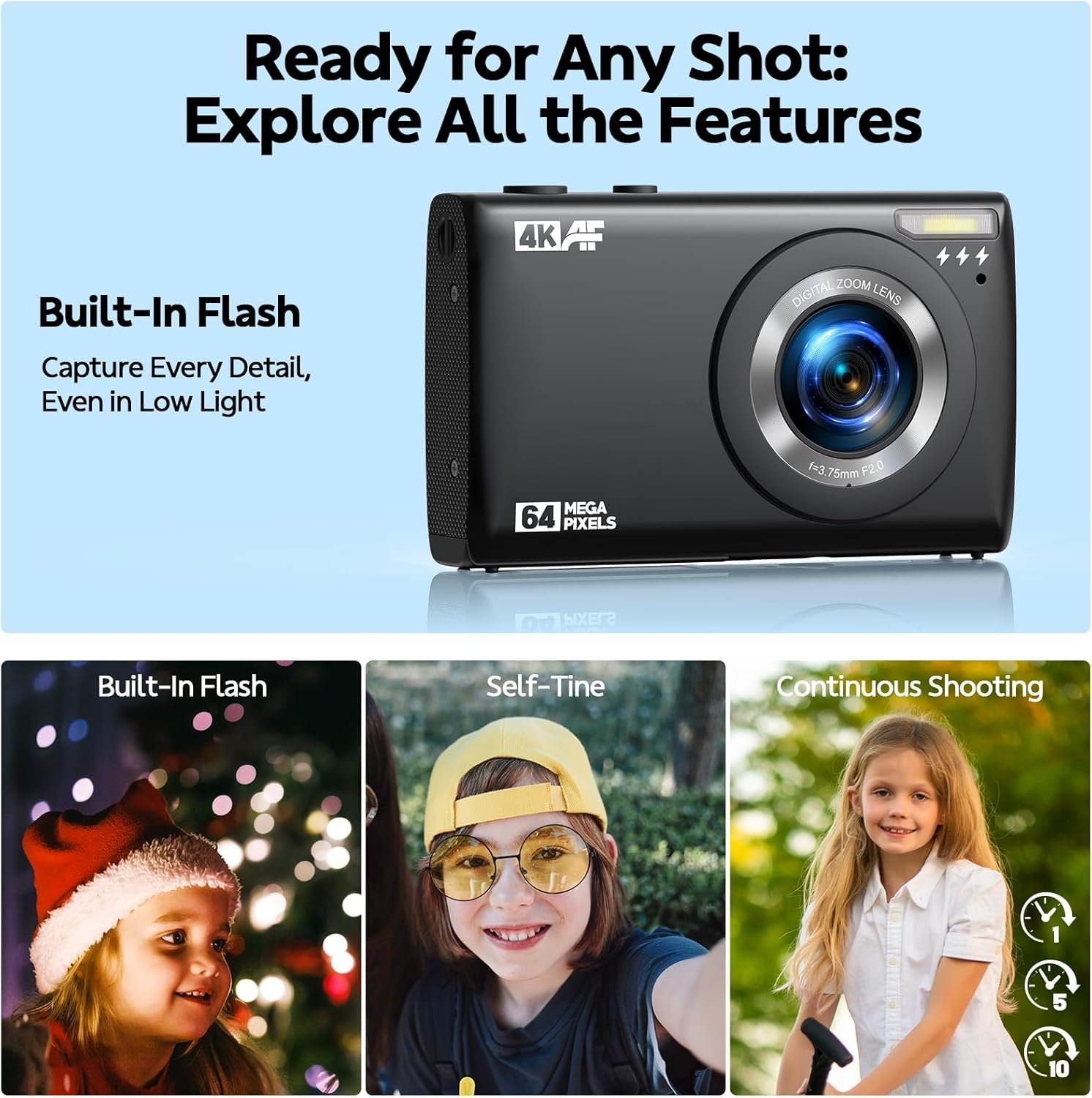 MULTIFUNCTIONAL PHOTOGRAPHY CAMERA: The 4K digital video camera features a date stamp, exposure compensation, video pause and playback, time-lapse, slow-motion, giving your videos a creative edge. Additional features like a fill light, continuous shooting, autofocus, self-timer, and various filters encourage you to stretch your creative boundaries.