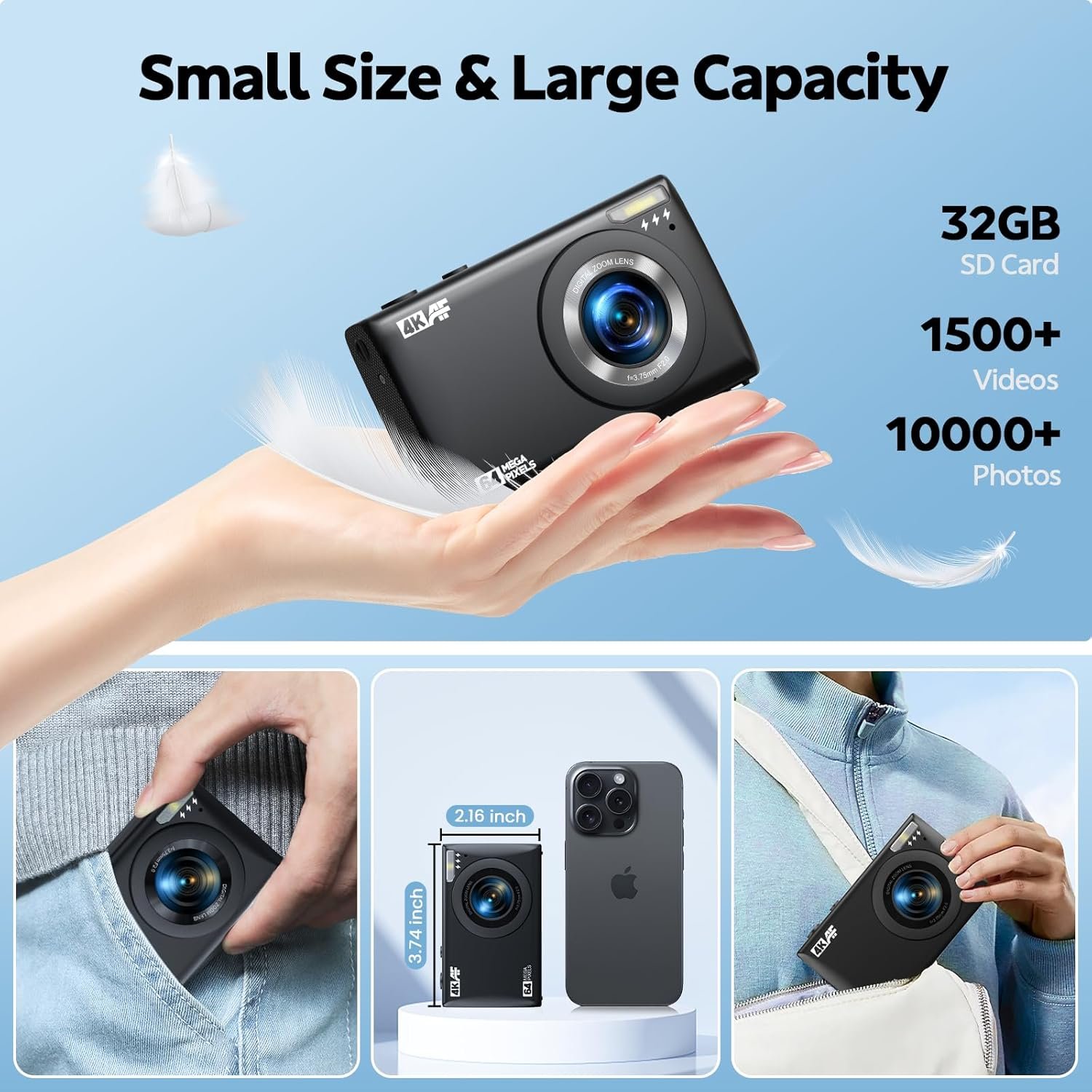 Mode: video/ photo / loop recording / slow motion recording / replayVideo: 4K / 2.7K / 1080P / 720PRecording Sound: on/offKids Camera Digital Loop Recording: 2min/ 3min/ 5 min/ CloseLED: on/offImage: 64MP/ 56MP/ 48MP/ 44MP……Auto Power-Off: 1min/ 3min/ 5 min/ 30min/ 60min/ ClosePoint and Shoot Digital Cameras Image Format: JPGVintage Digital Camera Video Format: MP4Pocket Digital Camera White Balance: Auto/Suny/Cloudy/Fluorescent Light/Incandescent Light4K Digital Camera Memory Card: Supports Class10 max up to 64 GB Micro SD Card4K Camera Time Watermark: On/OffBeginners Digital Camera Auto Screensaver: 10s/ 20s/ 30s/ Close