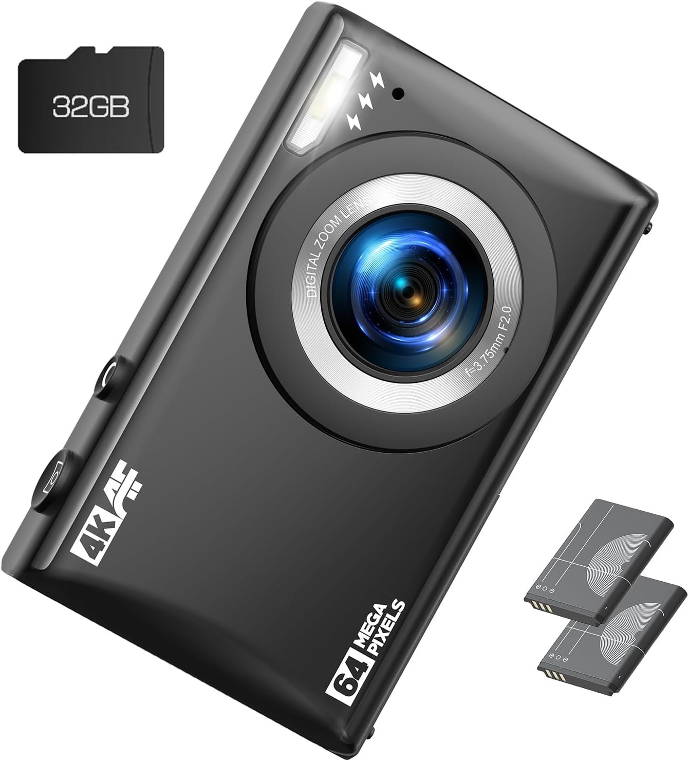 4K Digital Camera for Vlog 64MP Autofocus 32GB Card, Point and Shoot Digital Cameras with 18X Digital Zoom, 2 Batteries, Compact Travel Camera for Teens Boys Girls Kids Black
