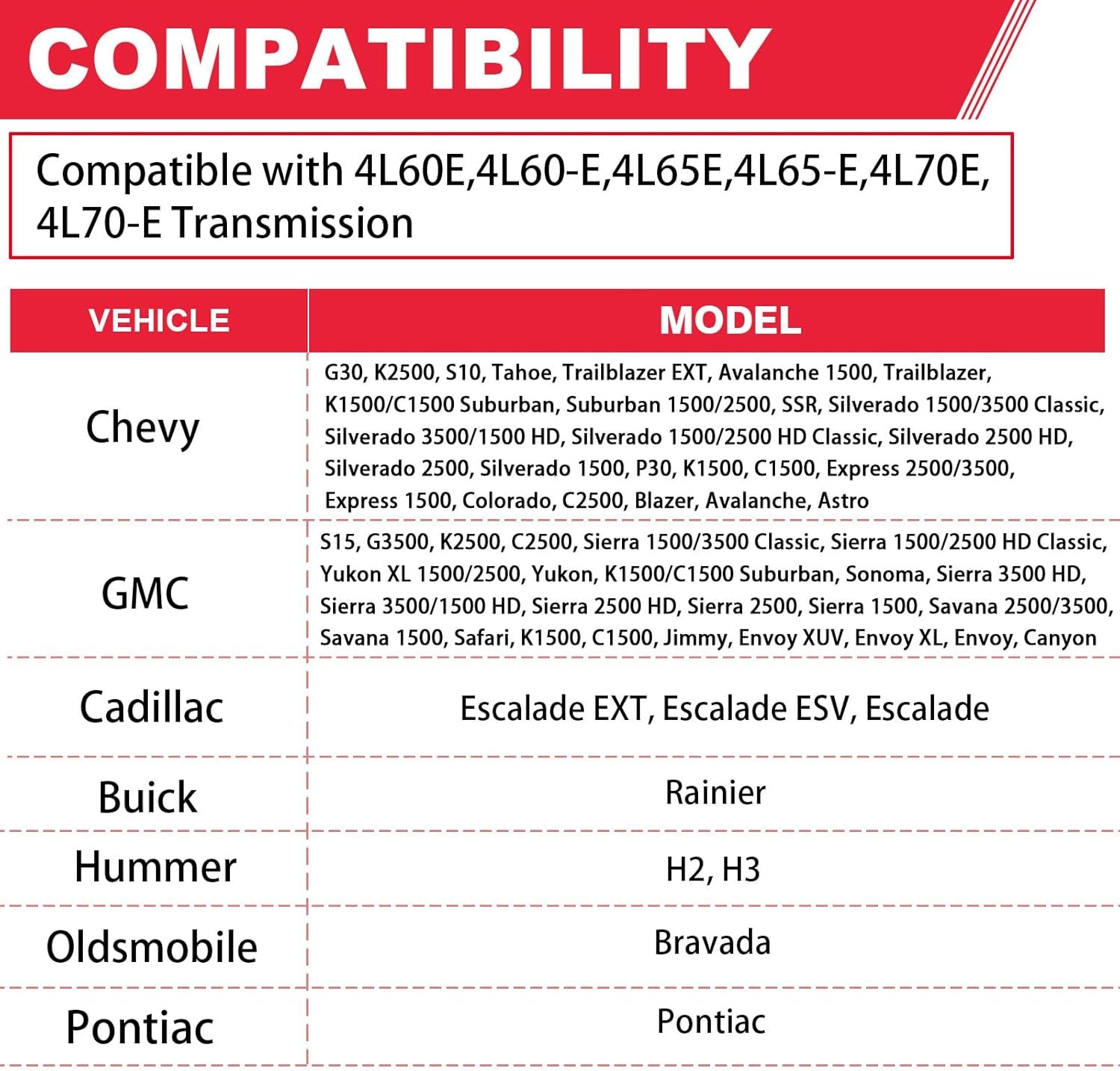 【Compatible】Compatible with 4L60E Transmission.Fit for GMC Vehicles: 2007 Sierra 1500/3500 Classic; 2007 Sierra 1500/2500 HD Classic; 2000-2009 Yukon XL 1500/2500; 1998-2009 Yukon; 2007-2013 Sierra 3500 HD; 2001-2006 Sierra 3500/1500 HD; 2001-2013 Sierra 2500 HD; 1999-2004 Sierra 2500; 1999-2013 Sierra 1500 and More.Fit for Chevy Vehicles:2007-2013 Silverado 3500 HD; 2007 Silverado 1500/3500 Classic; 2001-2006 Silverado 3500/1500 HD; 2007 Silverado 1500/2500 HD Classic; 2001-2013 Silverado 2500 HD and More.For More Models, Please Refer to the Detailed Description or Adaptation Table to Select.