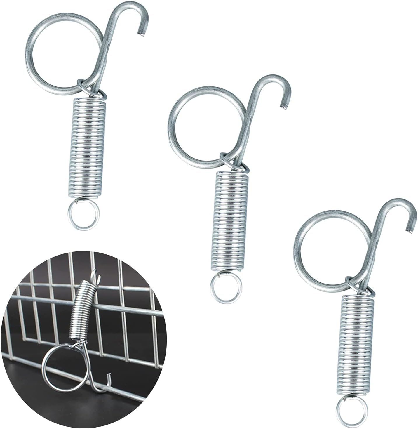 Materia: Steel Size:L:2.8in After a long time of use, the spring latch hook is still tough and not easy to relax The round pull ring design makes it easy to open/close the pet cage door by hand The installation is very simple, the two ends of the spring can be tightened to firmly fix the door of the pet cage Package includes:4pcsxrabbit cage Spring Latch Hook Color: As shown