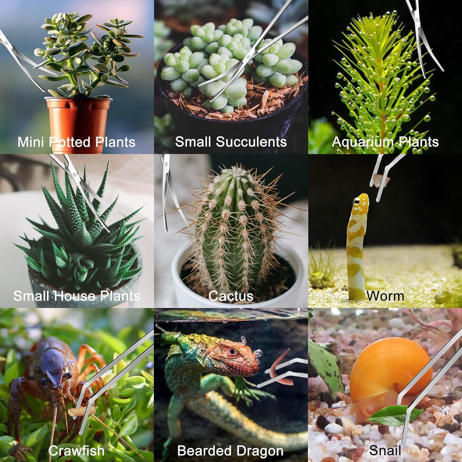 LONG ENOUGH: This 4-in-1 aquascaping tools kit that are long enough to easily use in fish tank under 10 gallon. 10.6” Straight aquarium tweezer×1, 10.6” curved long aquarium tweezers for aquarium×1, 9.7” curved aquarium scissors for plants×1, 12.6” aquascaping spatula×1. Makes trimming plants, moving plants around, smooth out substrate much easier.