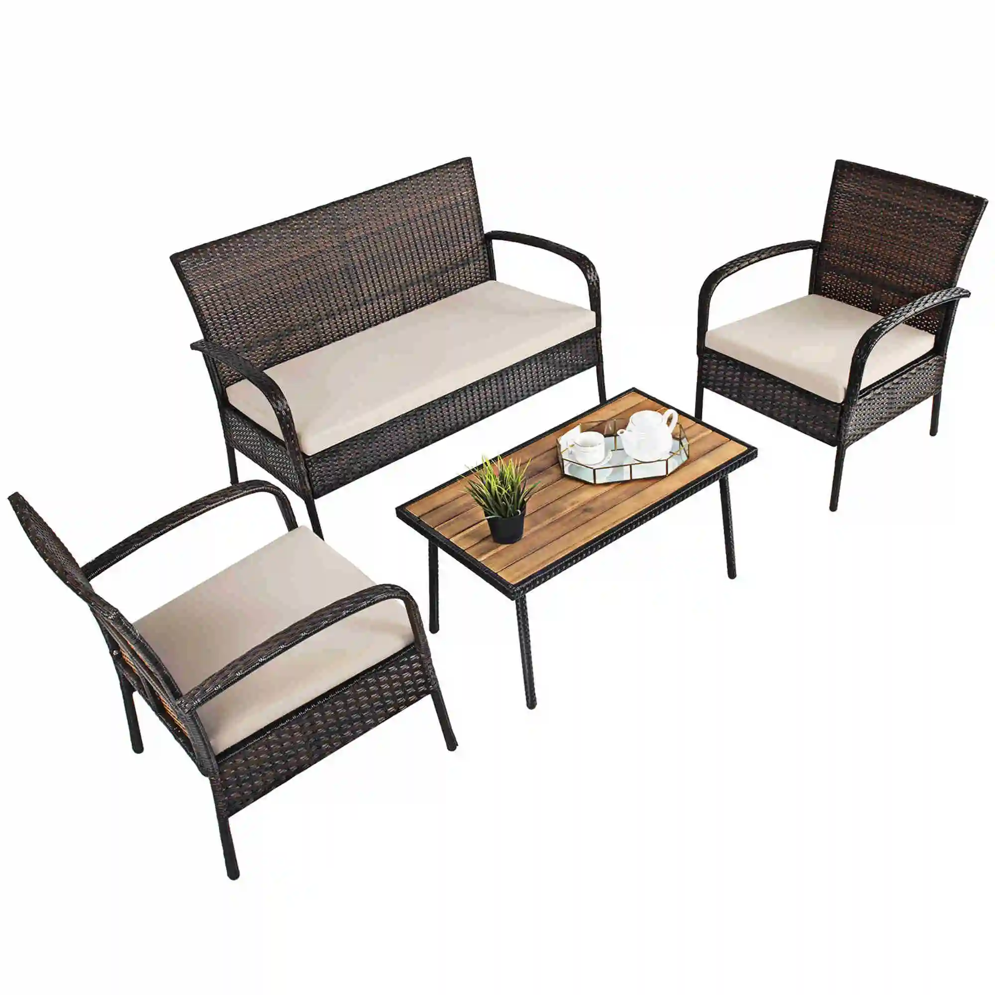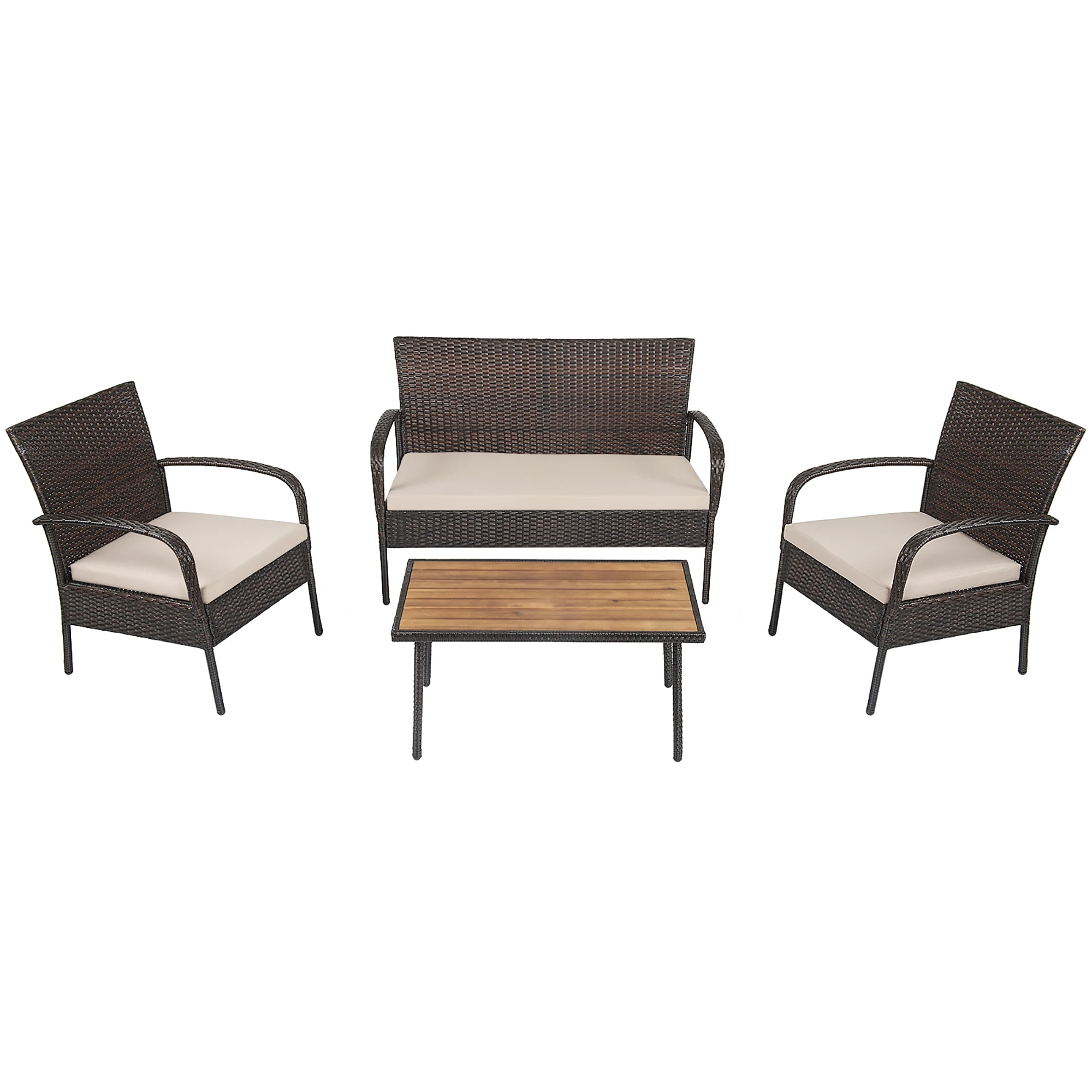 The 4-piece rattan sofa set is suitable for most scenarios, such as backyard, poolside and balcony. The frame of set is made of heavy-duty steel and wrapped with rattan, which is sturdy for long time service. And the tabletop is crafted from solid acacia wood, which is not easy to crack and will provide spacious space to hold food and drinks. Besides, the single sofa and loveseat with ergonomic body-hugging curve provide excellent comfort for you. All of the single chairs and loveseat are equipped with soft and high-resilient cushion for seat. This rattan furniture set will go well with various home styles, which is a perfect complement for your house.