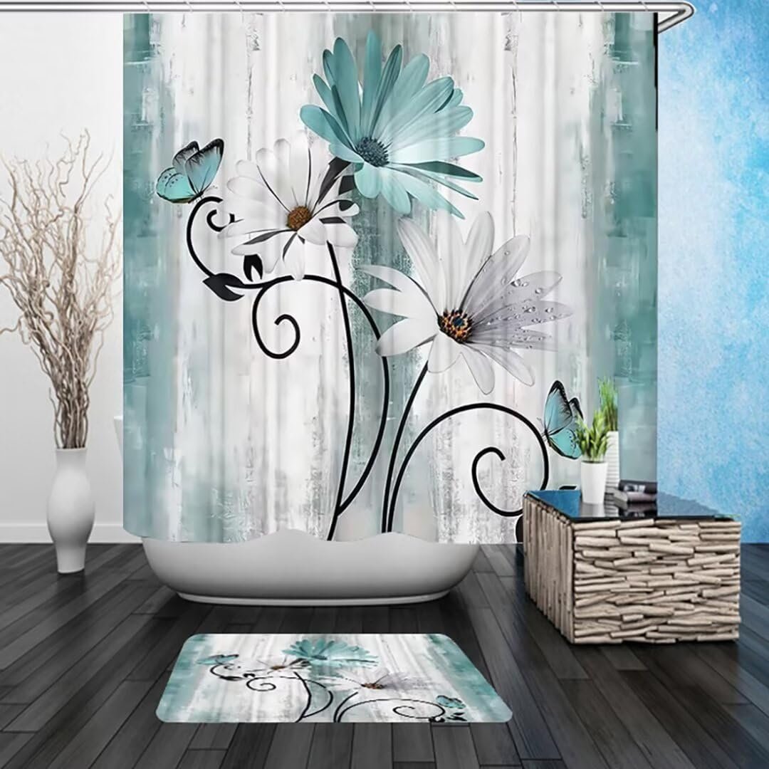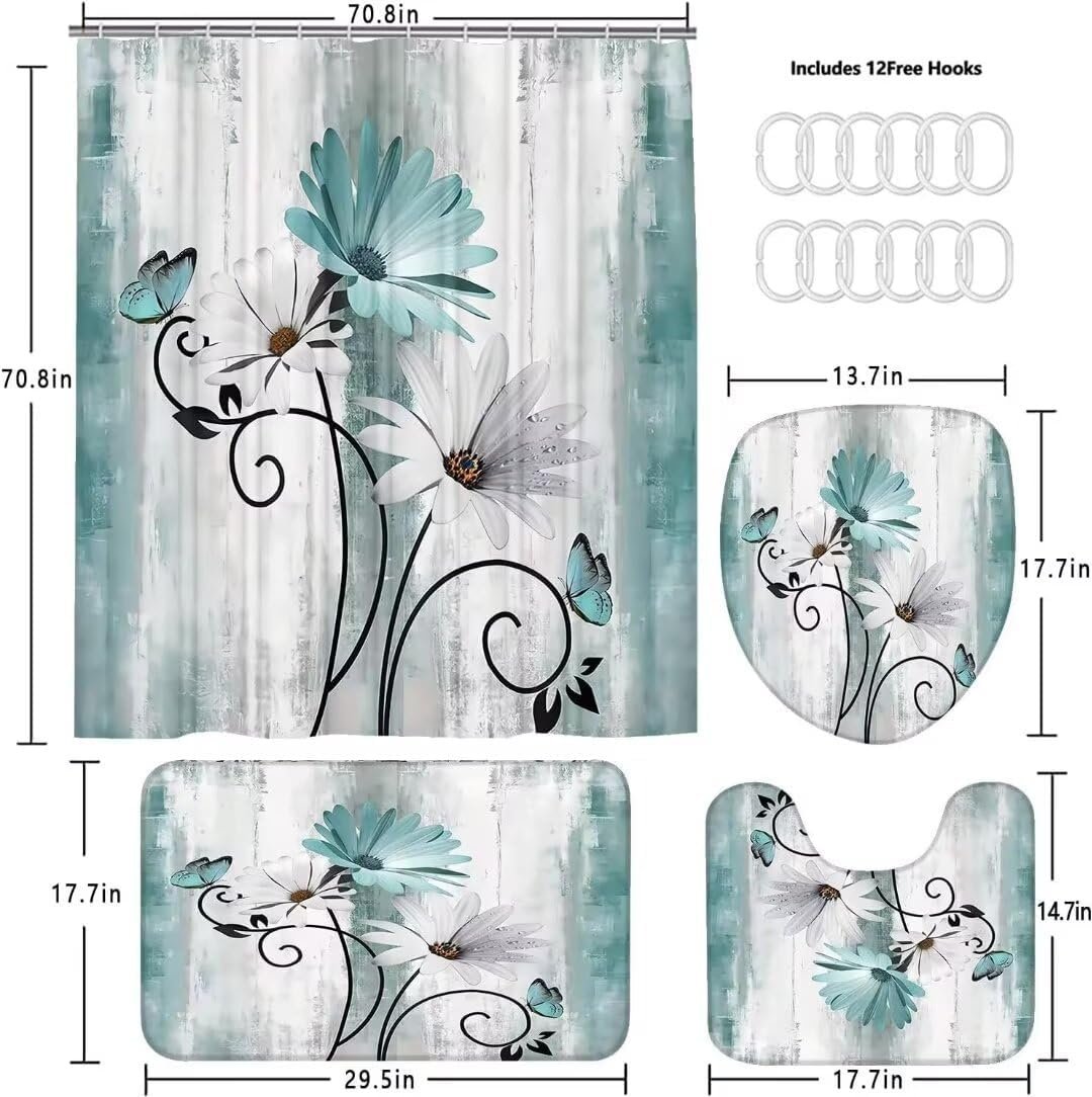 4PCS Rustic Teal Flower Farmhouse Shower Curtain Set,Waterproof Teal Daisy Floral Bathroom Decor Accessory Set