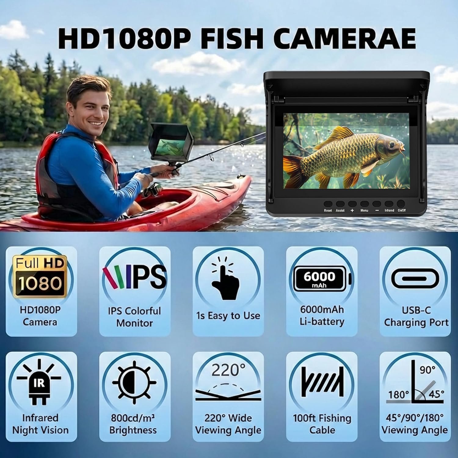 5″ IPS Underwater Fishing Camera, 220° Ultra-Wide View, 6000mAh Battery Ice Fishing Camera, 2000 LUX Sunlight Visible, 1080P Night Vision, 100ft Reinforced Cable, Fish Finder for Ice Lake Boat