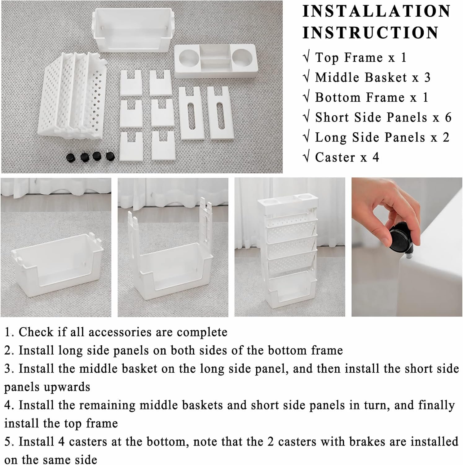 Parts list: Top frame x 1 Middle basket x 3 Bottom frame x 1 Short side panel x 6 Long side panel x 2 Caster x 4