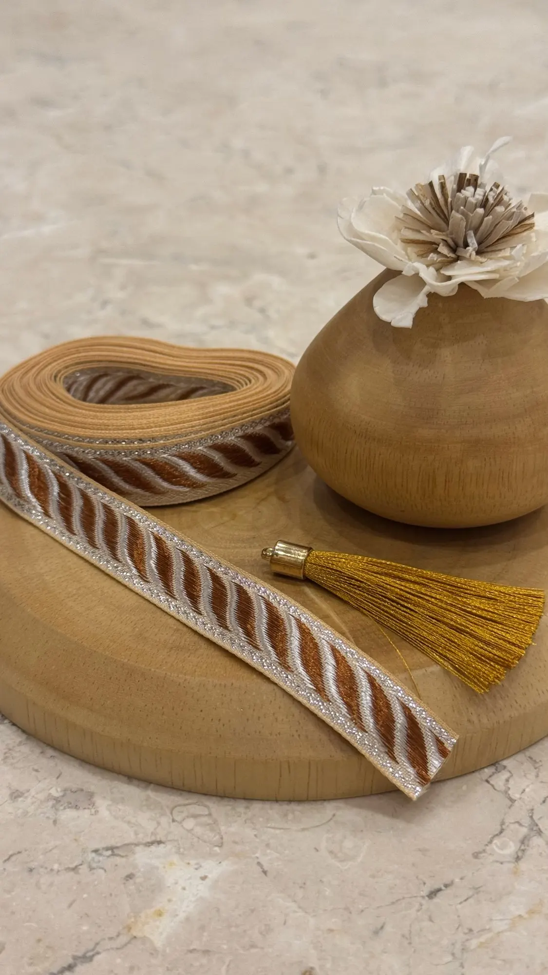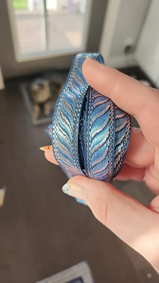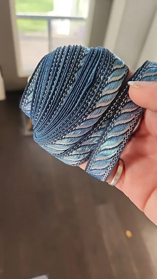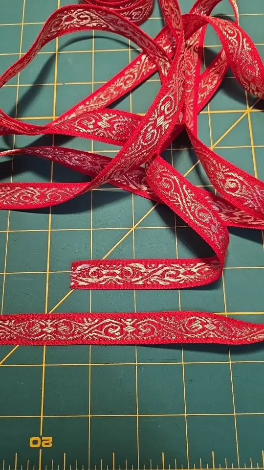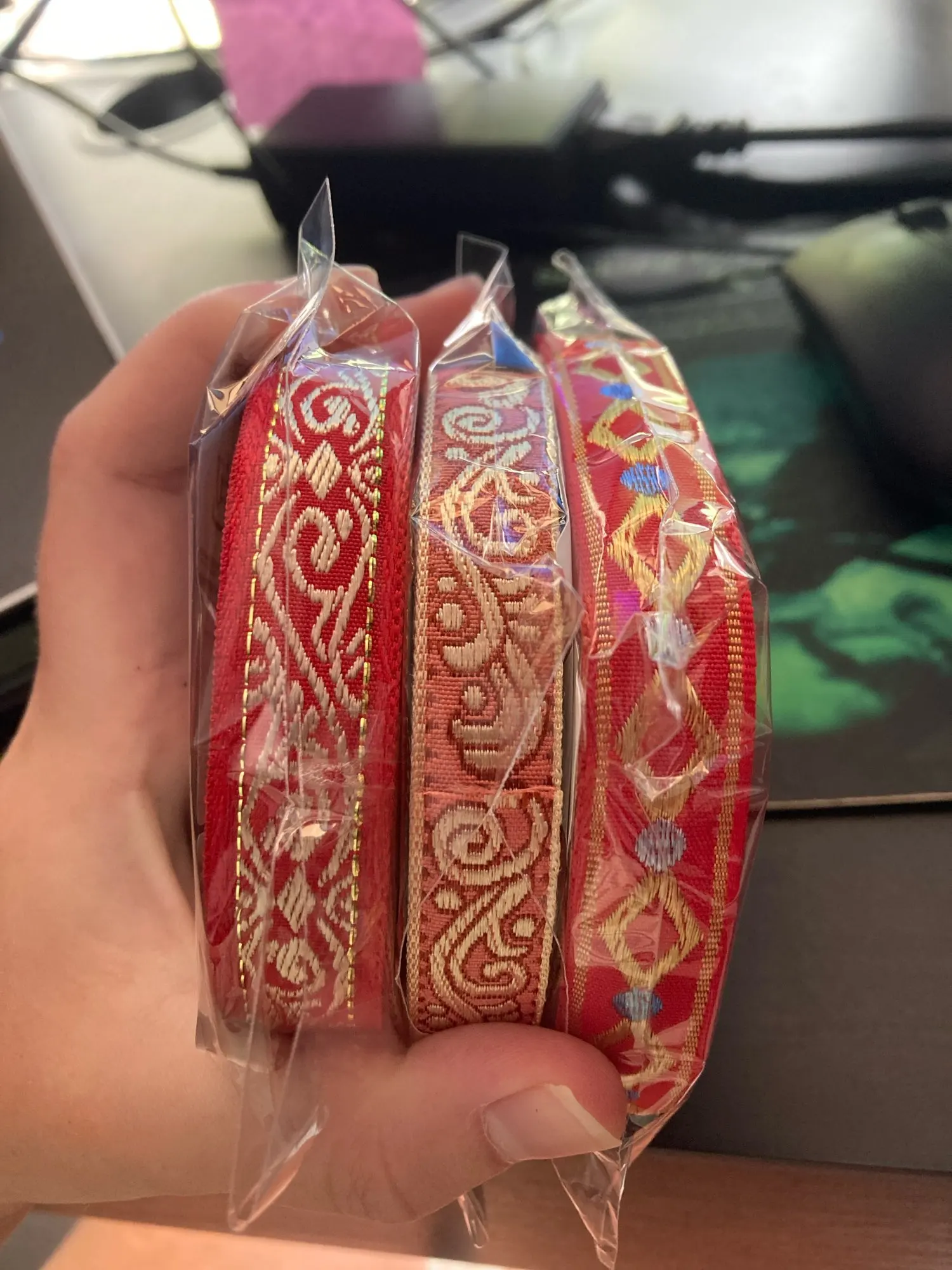 The item looks as it does in the images. The ribbon is lightweight with vivid colours, and the edges are a shiny metallic gold thread. Quality is good. Shipping was fast. Ribbon was a little bit longer than the 5 m advertised, so even better than expected.