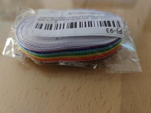 Exactly as described with bright rainbow glitter ribbon. Well packaged and arrived within less than 2 weeks (11 days). Only issue is that the ribbon is not on a roll, just rolled flat and packaged into small plastic bags. I ended up rolling several lengths onto my own cardboard roll so i could place it onto a ribbon rack. Is made of good quality thick material.