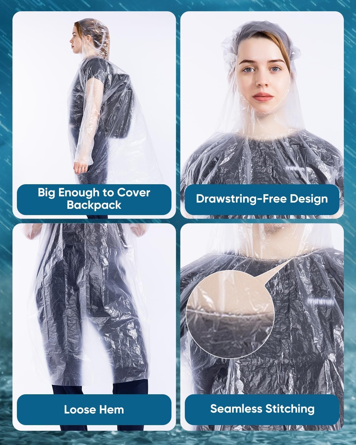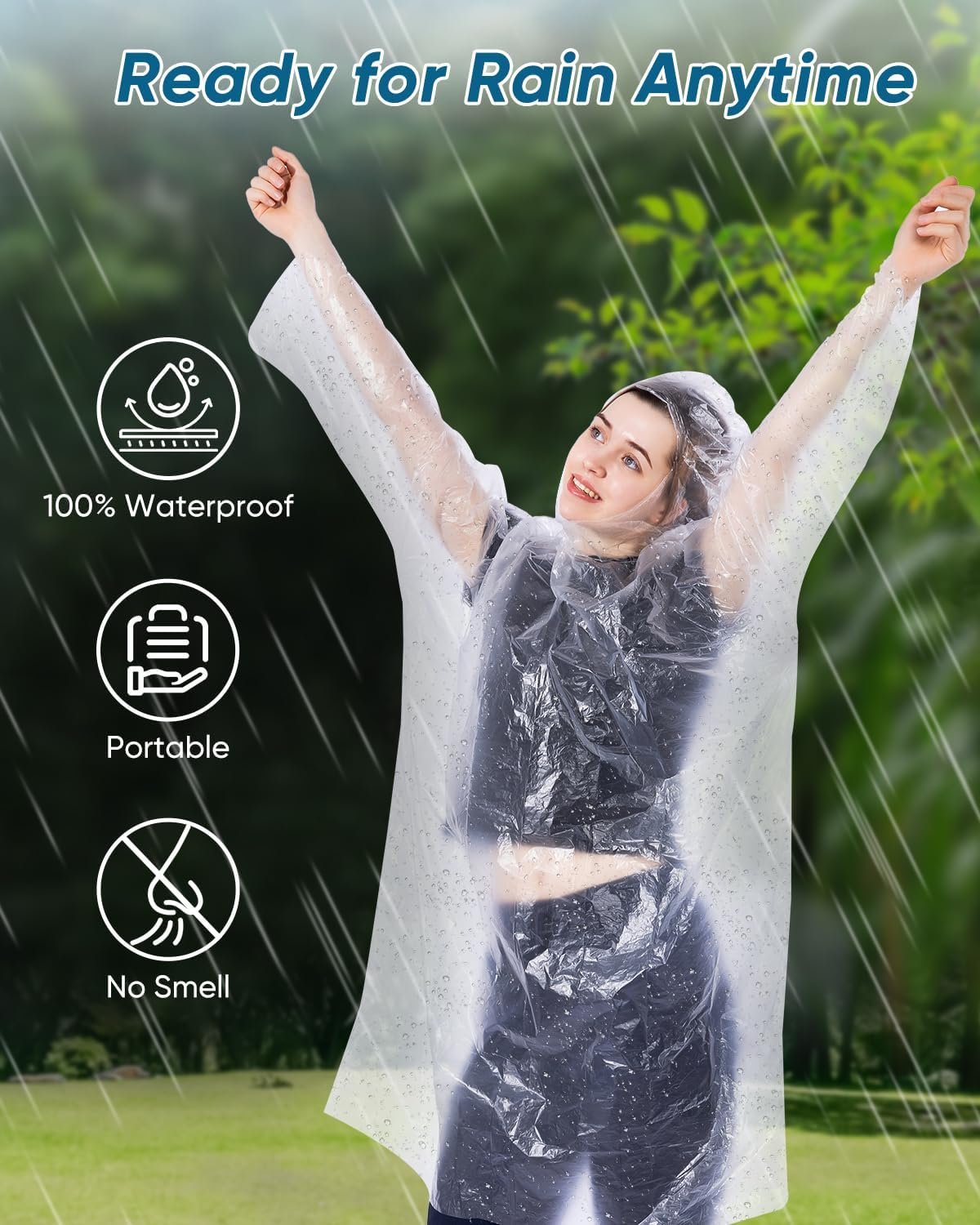 50/100 Pack Disposable Rain Ponchos with Hood for Adults, Family Pack Raincoats Bulk for Women