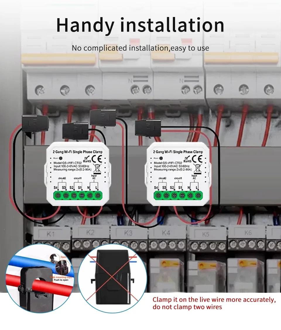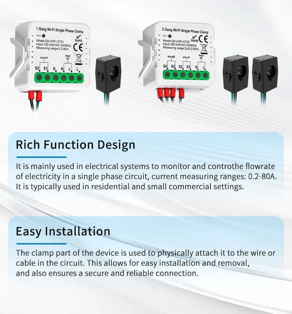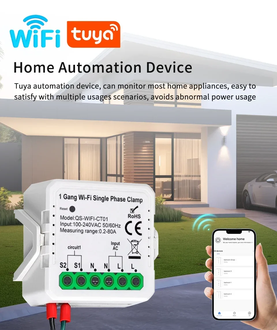 50/60Hz Tuya WiFi Smart Energy Meter AC100-240V 80A 1CH 2CH Current Transformer App Monitor Power Energy Consumption Statistics