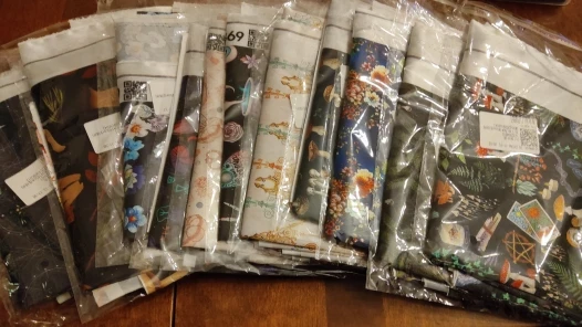 All good. Delivery was combined and took under 2 weeks. Colors are deep and sharp, hard to take a photo because of the shining. Material feels silky. No smells.