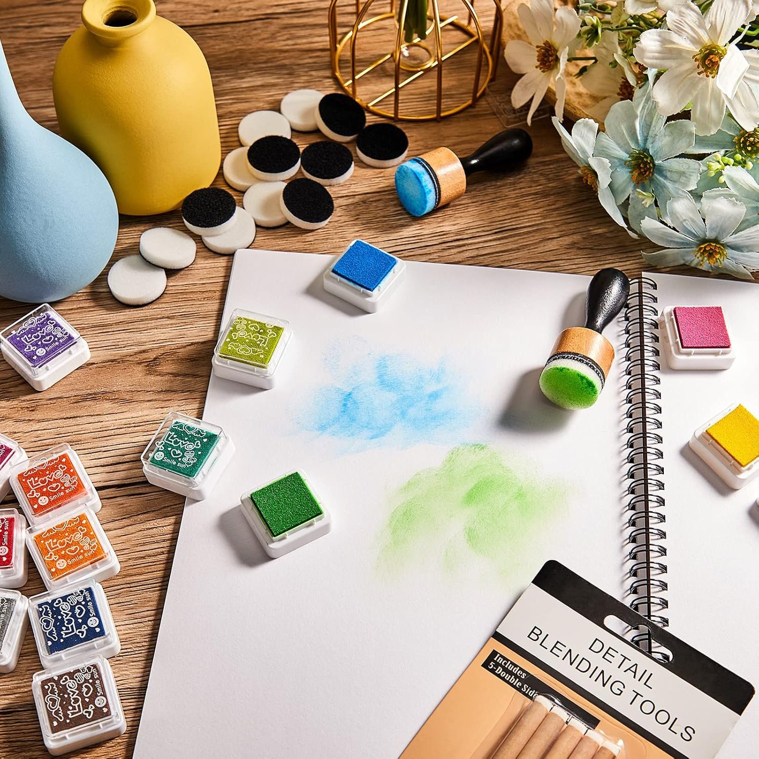 52 Pieces Mini Ink Blending Tools with Replacement Foam Detail Blending Tools and 24 Colors Stamp Ink Pad Stamps for Distressing Scrapbooking Wood and Fabric Applications