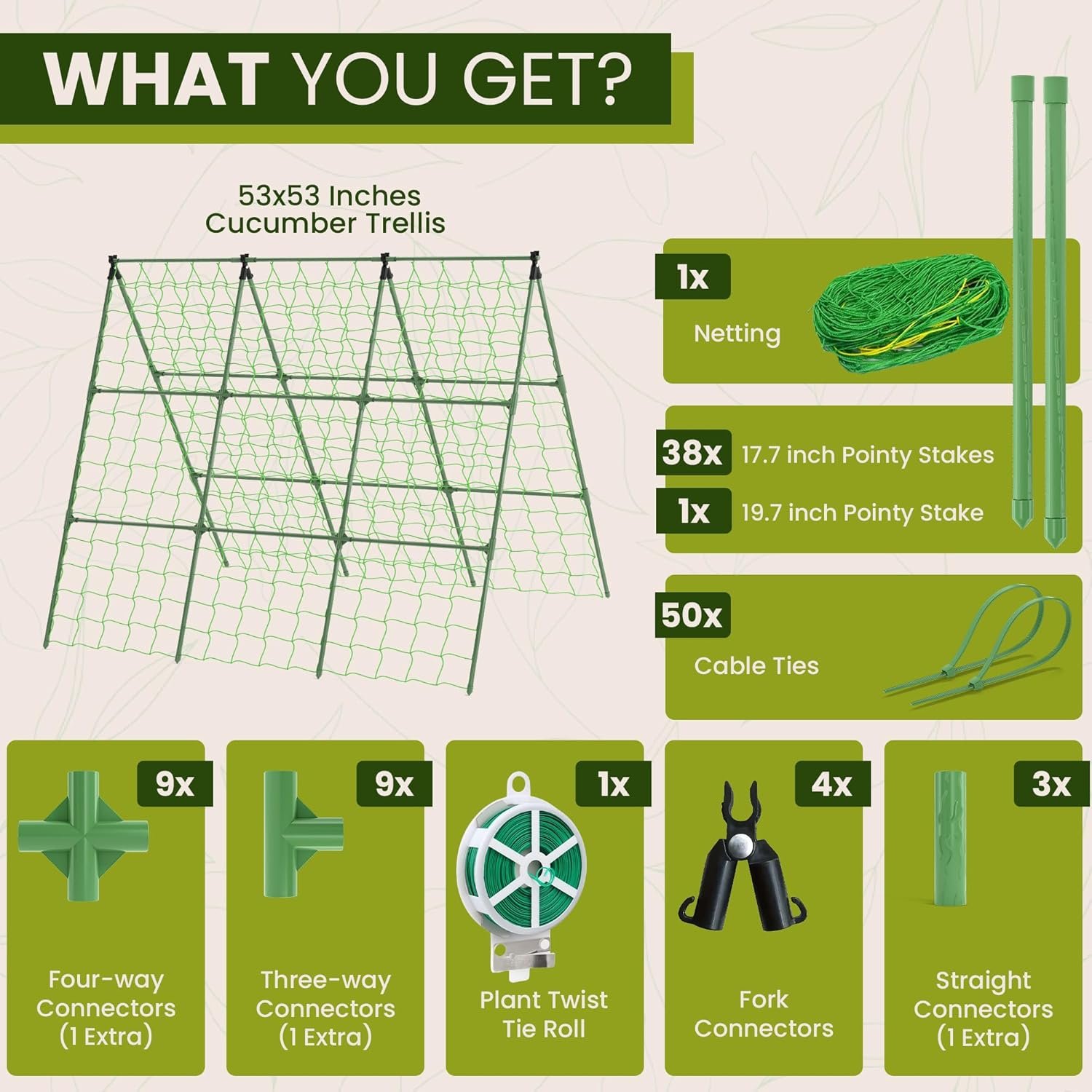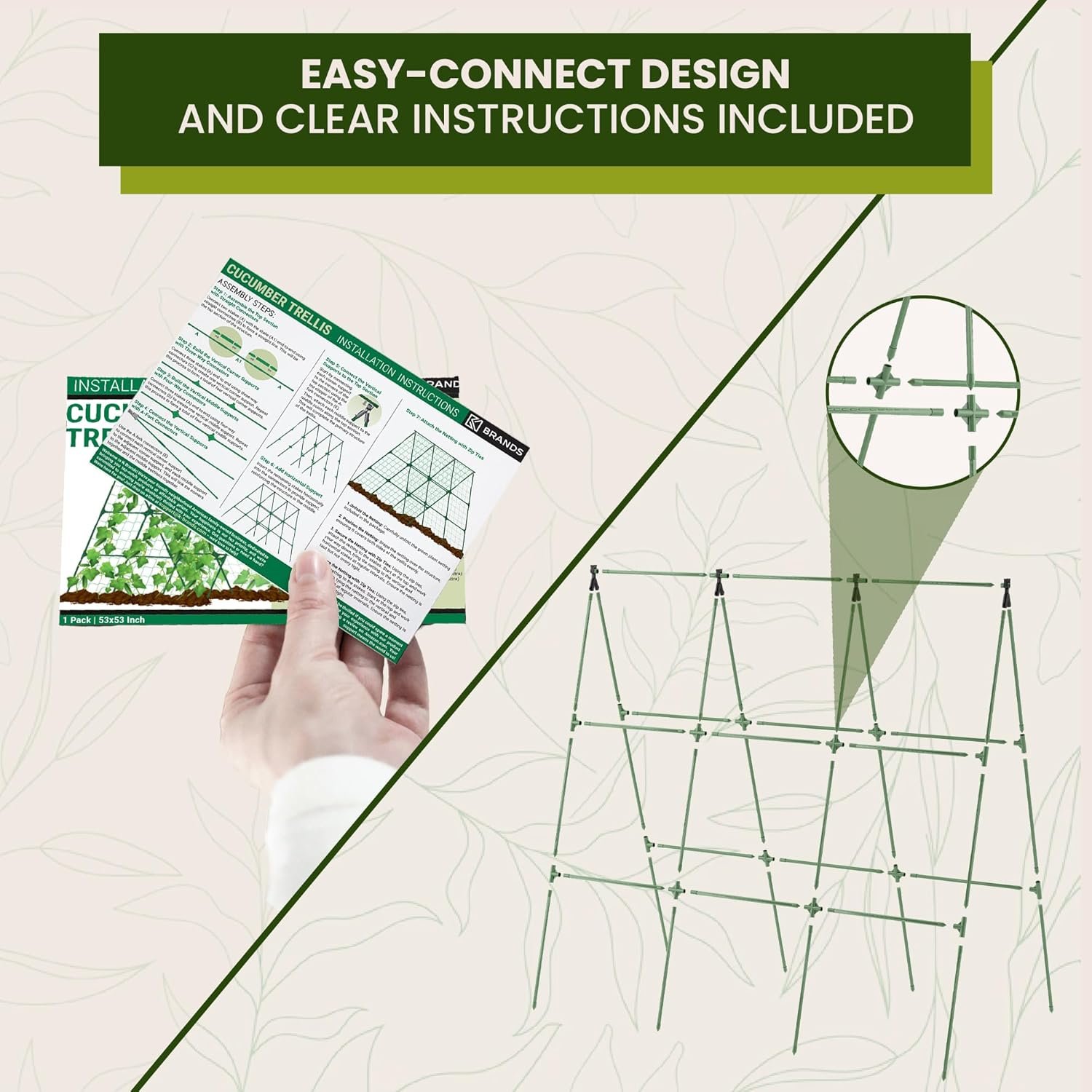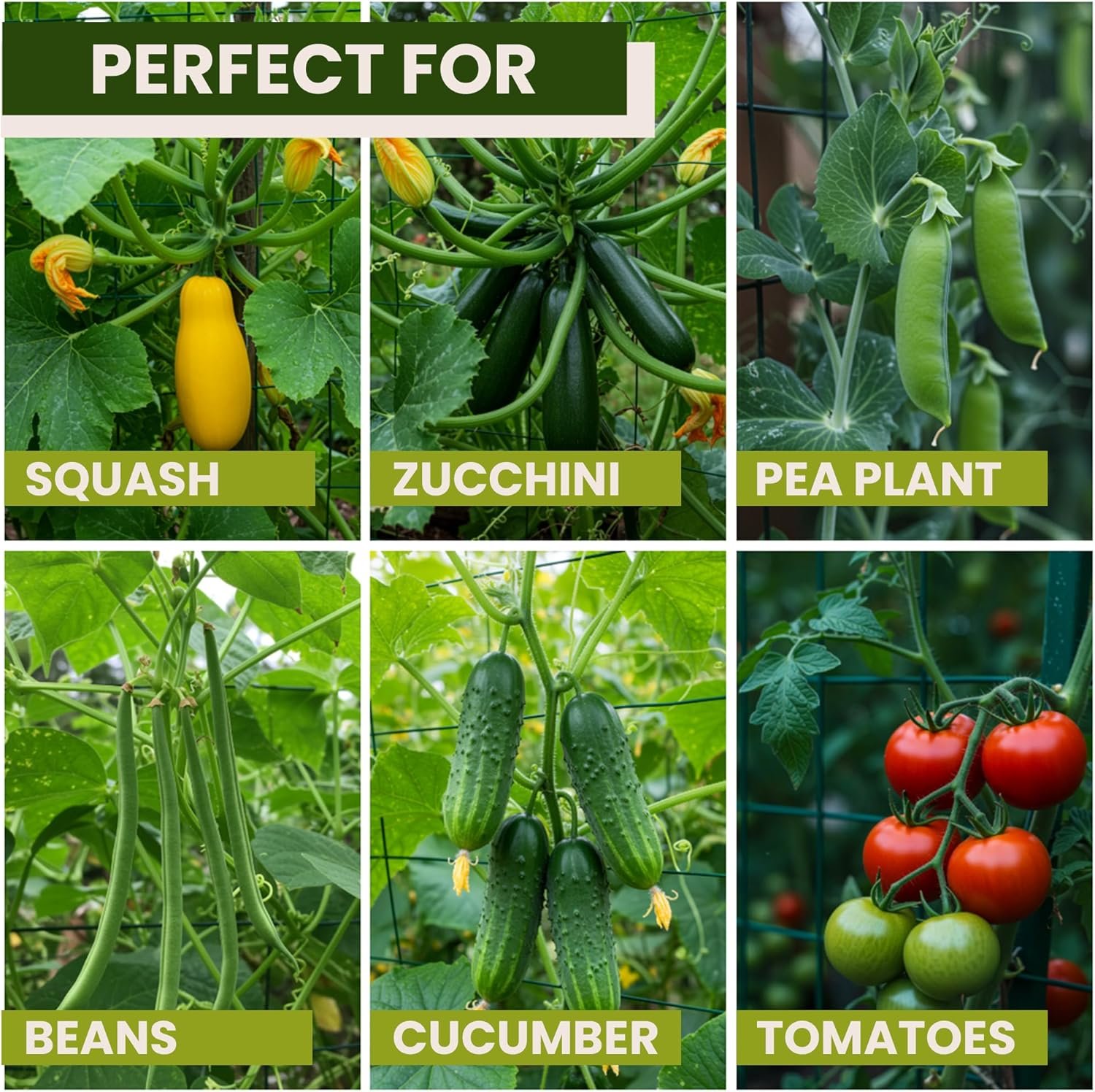 Designed for Cucumbers, Beans, Tomatoes & More – Sized perfectly based on gardener feedback, this 53×53″ trellis supports cucumbers, peas, squash, zucchini, tomatoes, melons, pumpkins, and other climbing veggies and vines.
