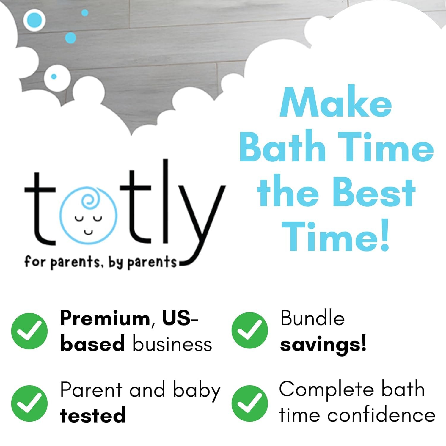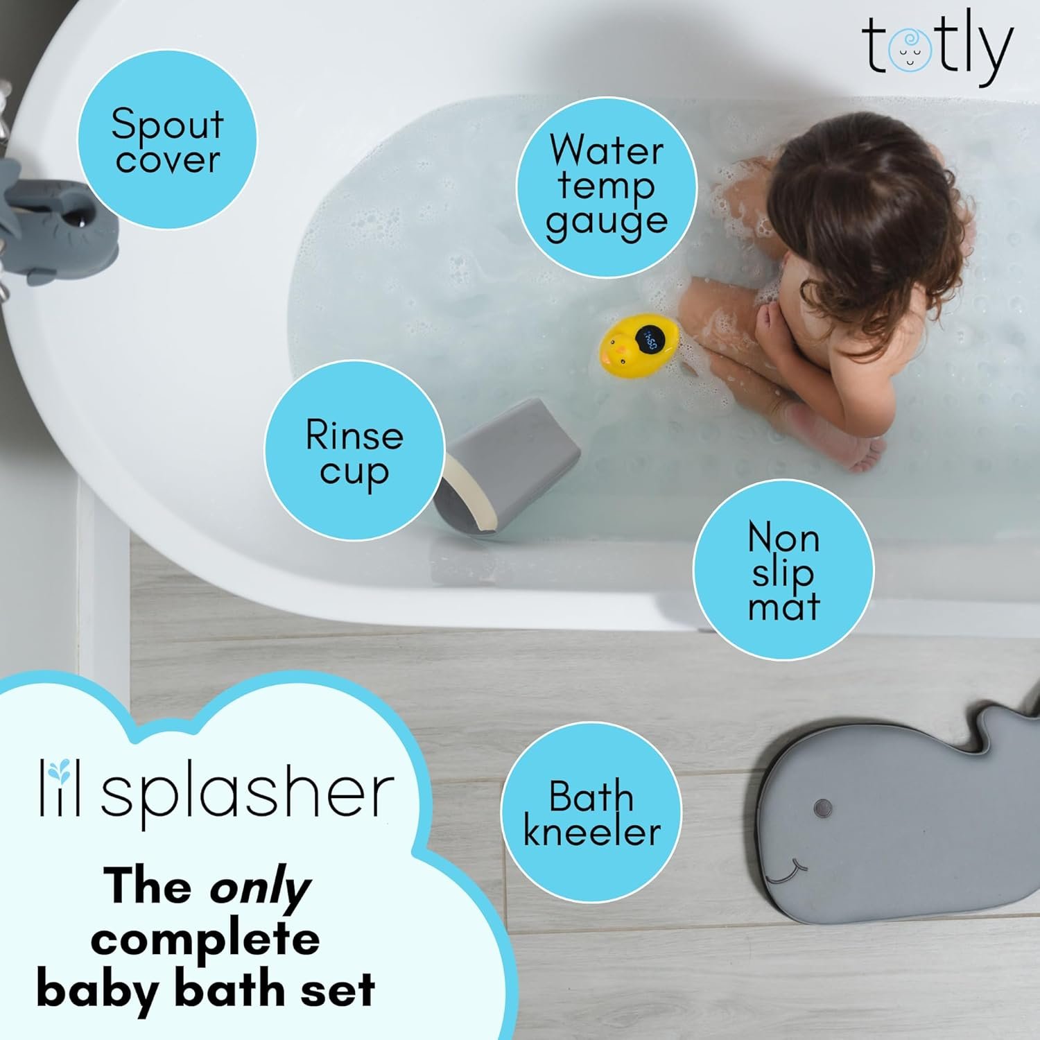THE ONLY COMPLETE BABY BATH SET: totly’s baby bath kit includes: bath kneeler, digital baby bath thermometer, non-slip baby bath mat, baby rinse cup, and bath spout cover – every essential you need for a safe, enjoyable bath.