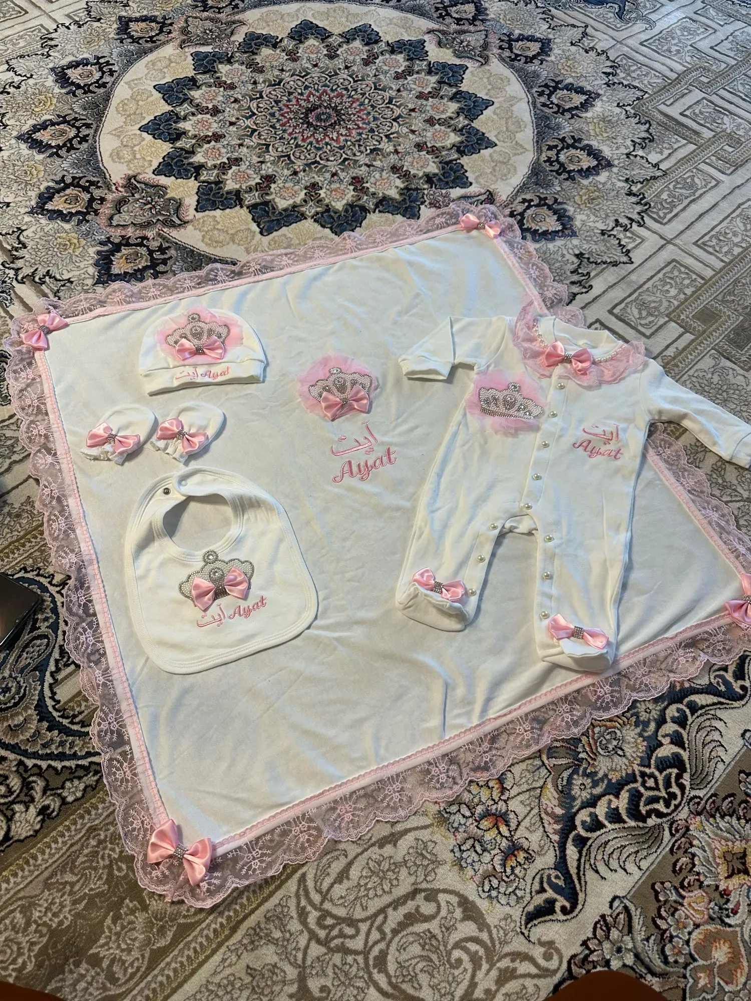 Our 5 pieces set is made up of soft, thick cotton. They are embellished with rhinestone buttons, crown jewels and bows.
