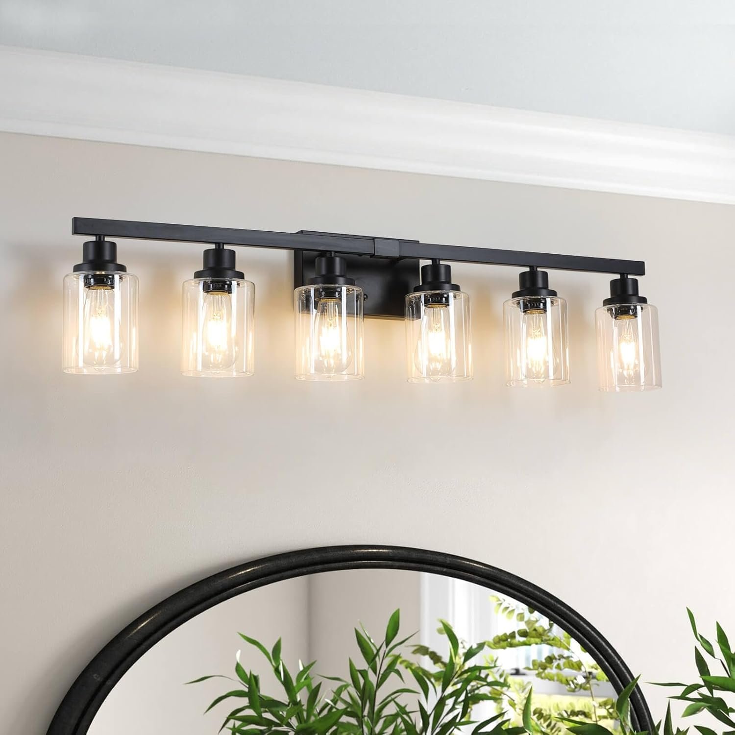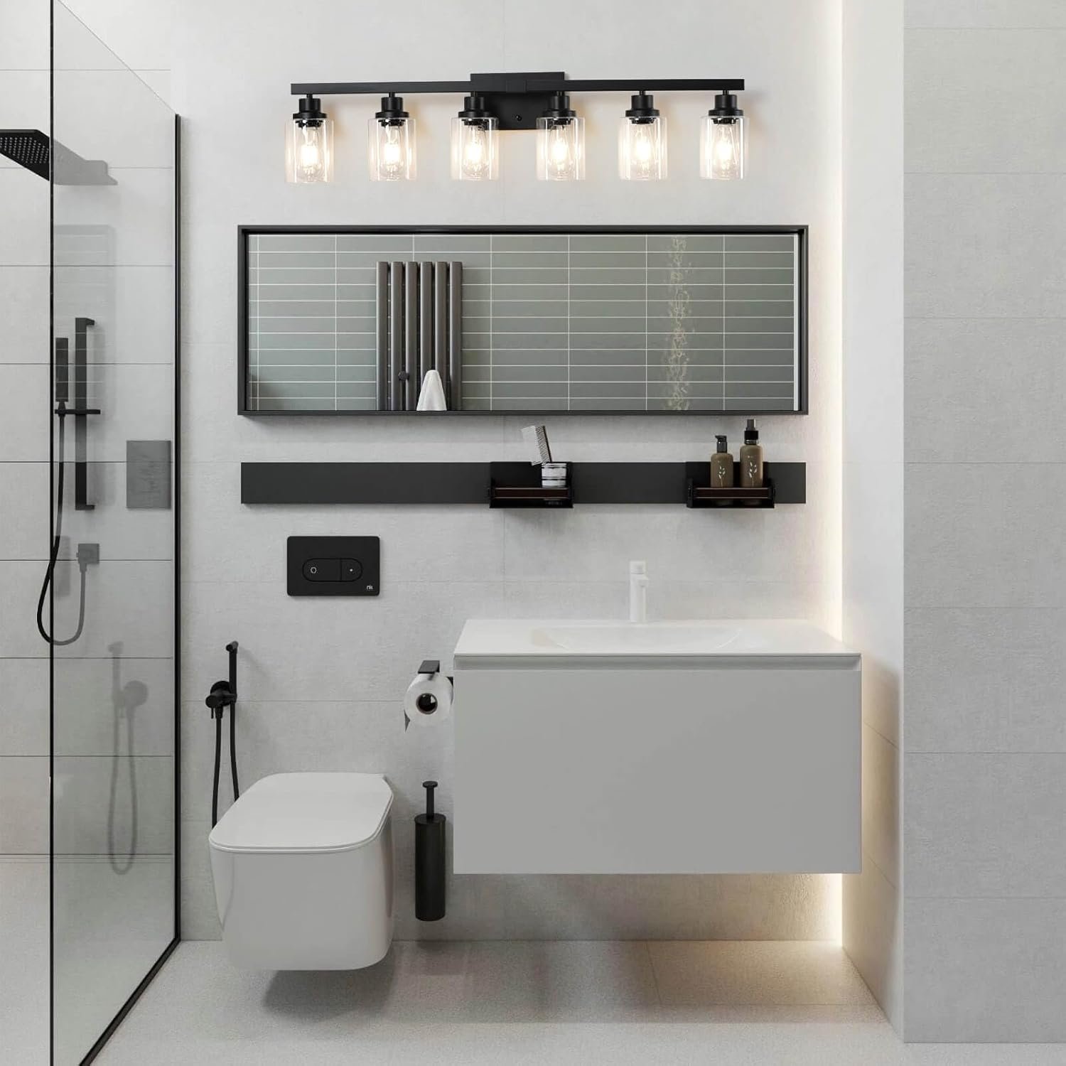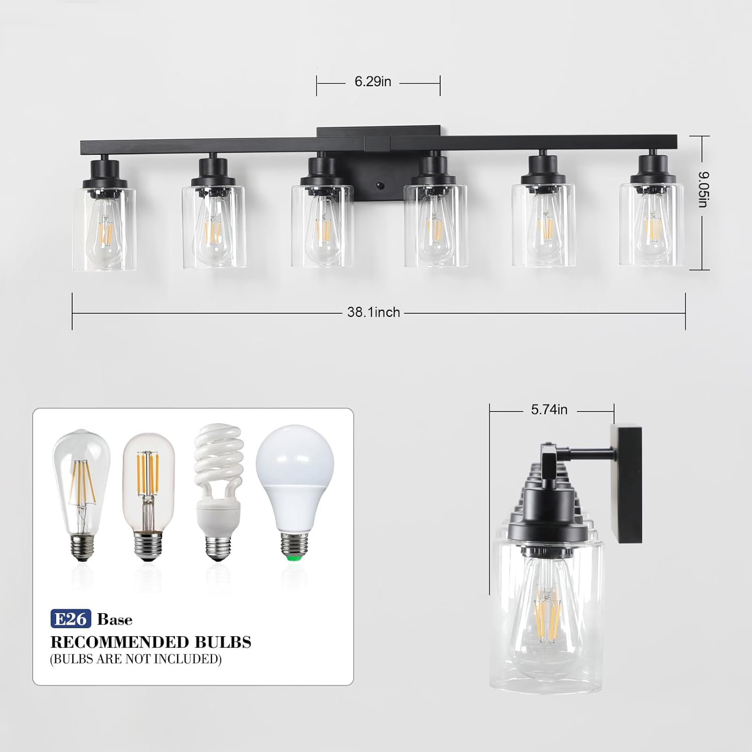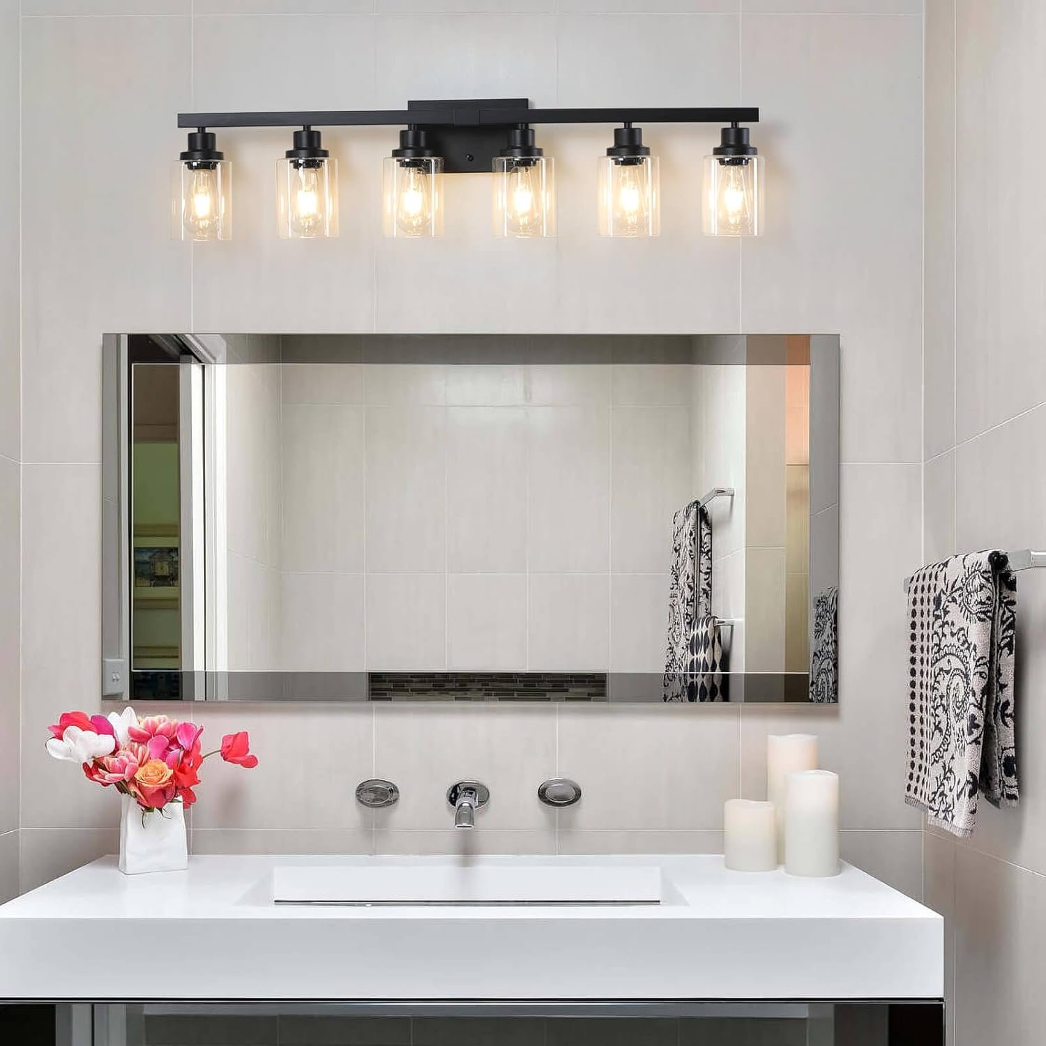 Sturdy Metal Construction: 6-Light Black Bathroom Vanity Light is made of sturdy metal in a matte black finish which no need to worry about getting oxidation and color fading. Additionally, High quality clear glass shades well protects the bulb and maximizes its light, and increases the classic ambiance in any space. Bathroom vanity light perfectly fit with any style. It will bring more exquisite and luxury to your home lighting. It is also the perfect choice for your home lighting