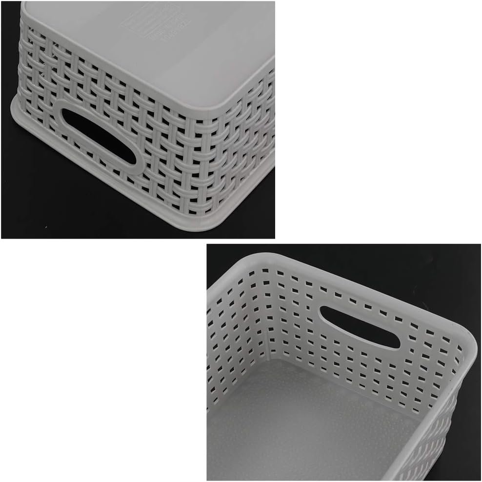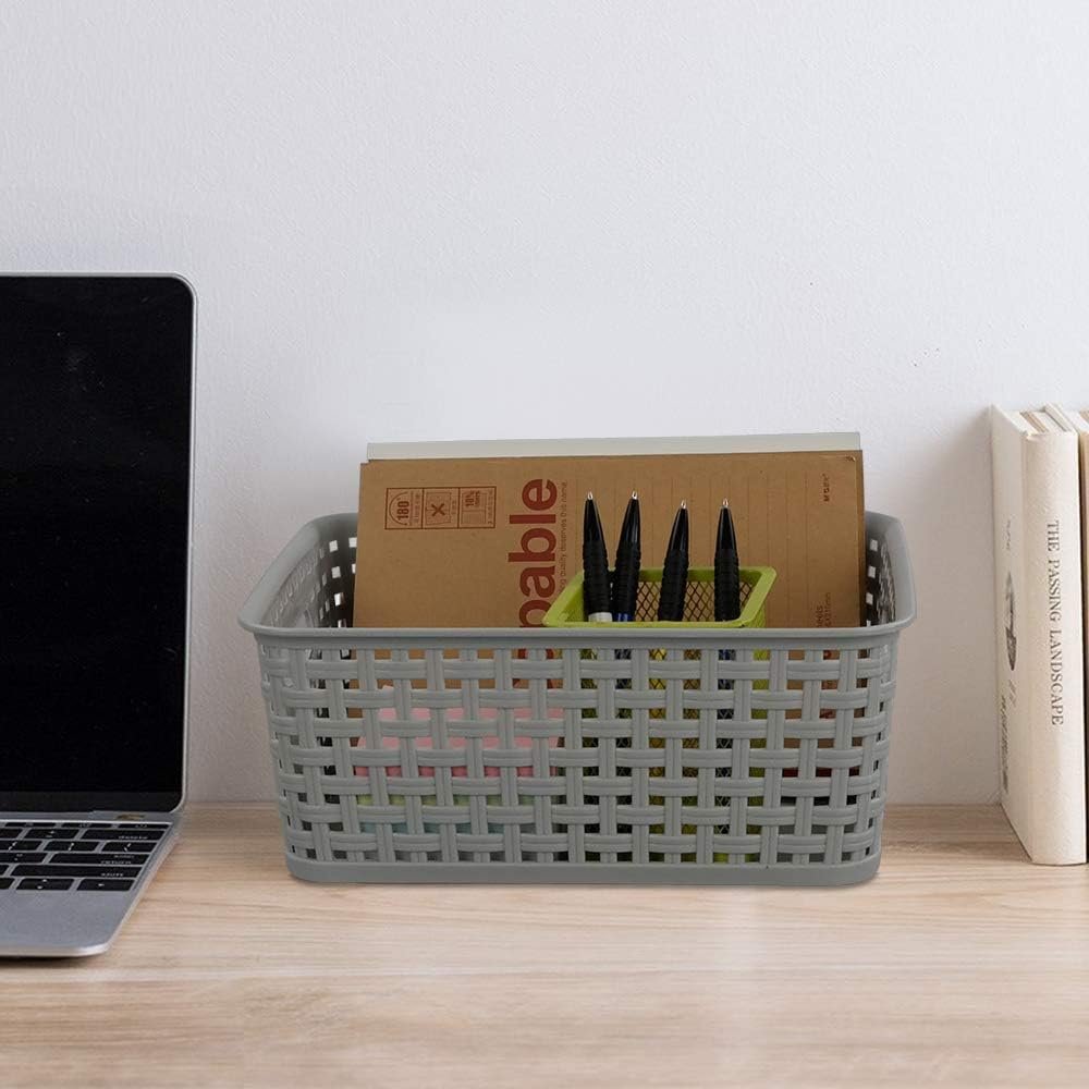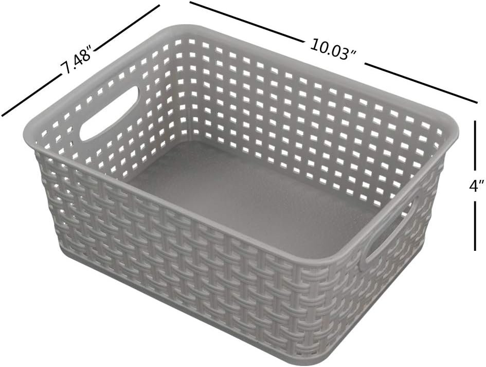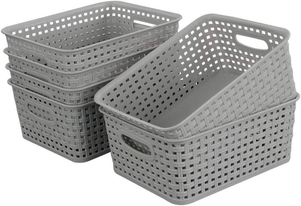 I love these gray plastic baskets. They were just what I needed to clean out under my bathroom sinks. Im so glad there were 6 in the pack bc thats just what I needed, and if not, Id use them for something else. They are neat looking with a basketweave design, definately a great value for the money.