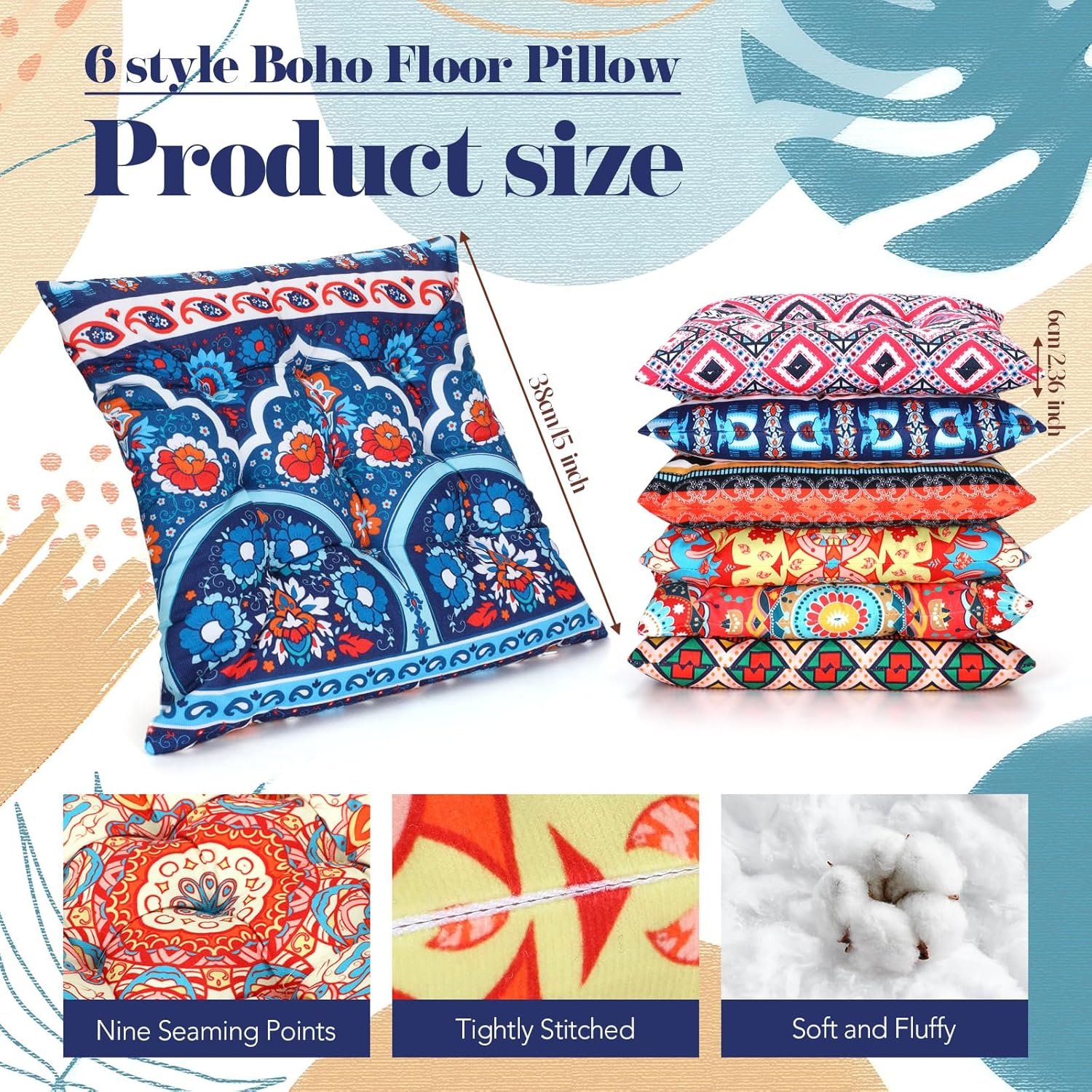 Vibrant Bohemian Design: the floor seating cushions feature eye catching, ethnic characteristics design, which is combined of floral and geometric patterns; The colorful plaid patterns, visual tie dyeing, and diverse styles of prints bring a strong visual impact and a mysterious atmosphere; Their Bohemian themed design makes them fit seamlessly into any decor, adding a stylish and chic vibe to your home